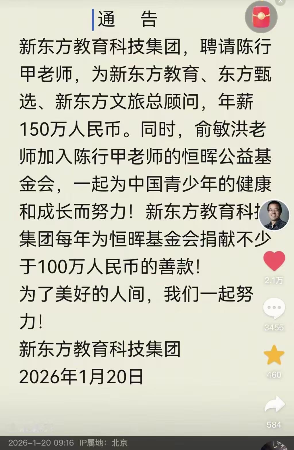 盯 着陈行甲公益拿工资的人,这回该哑火了。 谁能想到他前脚刚交完基金会交接手续,后脚就被新东方递了橄榄枝。 2026年1月18号晚,陈行甲 发视频说,交接完就不再从恒晖公益领薪水,这事源于2024年,他从基金会拿了73.01万税前收入,网友炸了:公益人怎么能拿这么多,哪怕基金会财务审计过,民政部门说合规,质疑声 还是没断。 结果没 几天,新东方官宣聘他,年薪150万,手续合法合理,之前 骂的人瞬间没话讲,人家不用公益工资,照样能靠本事赚更高的钱。 陈行甲的公益路是一步步走出来的,2016年底,他辞了湖北巴东县委书记的公职,创立恒晖儿童公益基金会,专注儿童大病救助和 教育关怀,之前他在巴东反腐出了名,2015年评上全国优秀县委书记,大家都夸他“敢啃硬骨头”。 恒晖2026年年报里写得清楚,陈行甲2024年薪资73.01万,每 一笔都 合规,但公众就是想不通:公益的钱是捐的,高管拿这么多会不会占了救助款,其实基金会的钱分两块,捐的钱专款专用,行政开 支有专门预算,他的工资从行政费里出,合规但架不住大家误解。 新东方找他也不意外,陈行甲有公信力,当过 好官,做过好公益,说话有人听,新东方要做教育公益或品牌背 书,找他再合适不过,150万的年薪,放在职场是高管级别,人家凭资历拿,没毛病。 这事戳中了公益行业的矛盾:大家觉得公益 人该“无私”,但专业化的公益需要 专业人才,管得好就该拿合理工资,陈行甲的决定,是对这种矛盾的回应,要么 让公众接受 专业薪资,要么自己找其他路径证明价值。 陈行甲这步走得聪明,之前的争议是“公益+高薪”的组合让大家不舒服,现在他把公益和职场分开,既守住了公益的底线,又用职 场收 入 证明了自己的能力,接下来 就看他在新东方能不能把教育和公益结合,说不定能闯出条新路。 普通网友路过:这操作可以啊,新平台新薪资,之前的争议算翻篇了,我觉得翻篇倒不至于,但至少证明他不用靠公益工资也能活,而且活得更好。 之前陈行甲因为公益高薪被骂,现在他辞了公益工资,转投新东方拿更高年薪,既回应了公众质 疑,又找到了新方向,但公益行业的薪酬标准,是不是该借着这事好好聊聊? 要我说陈 行甲这波挺实在的,公益不是“穷大方”,但公众认知转不过来,那不如先避开争议,用正规职场证明自己,反正他做公益的初心没变,只是换了个方式支持,总比被骂得抬不起头强。 这事你怎么看?