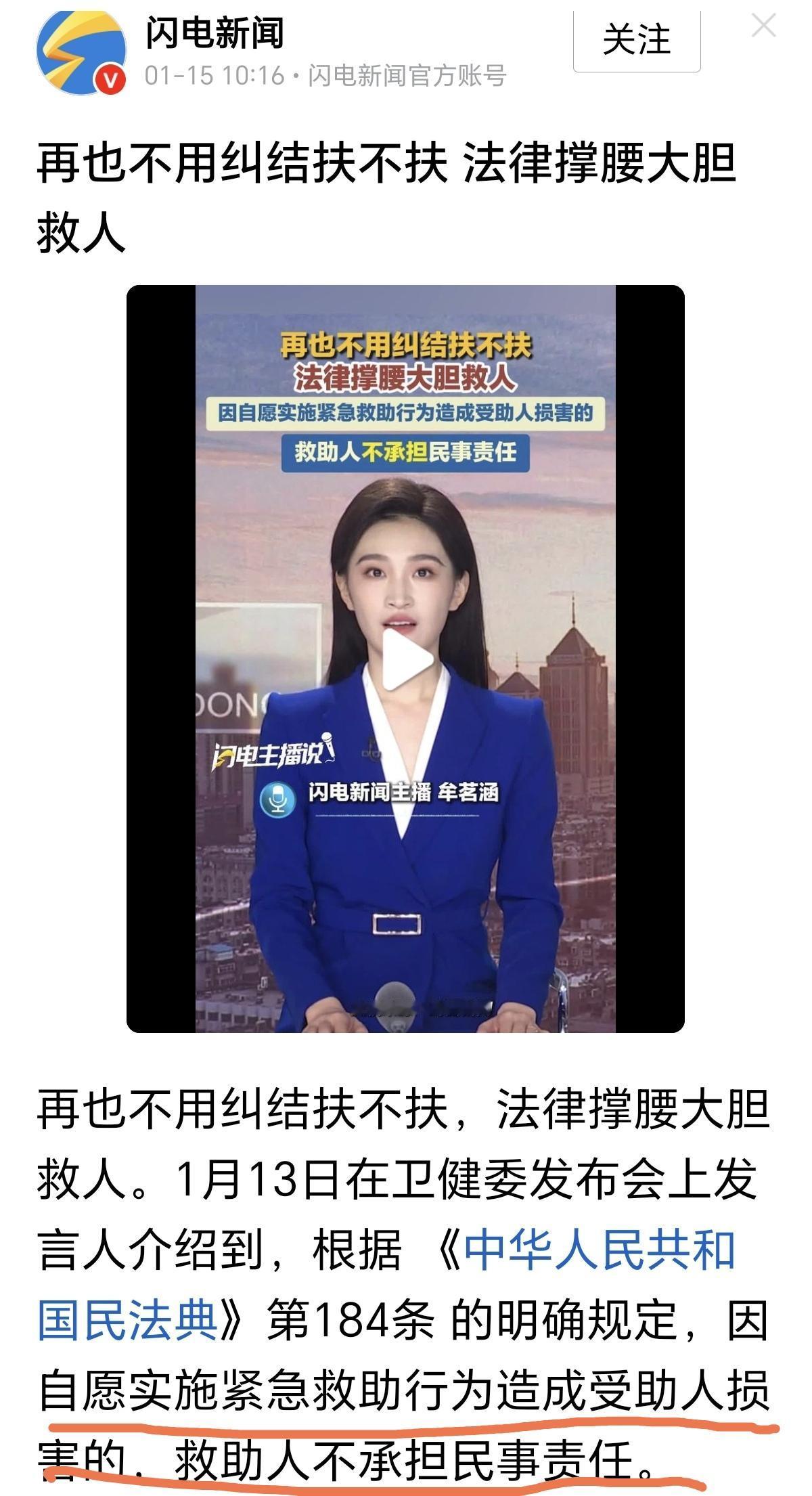 好消息!人倒了该不该扶的问题,现在不用纠结了,主动实施紧急救助,不承担潜在的民事责任。 走在街上遇到倒地的人,要不要扶一把呢? 不扶,良心上过不去;扶,担心摊上事儿。 之所以有这样的顾虑是因为前些年那起案子:“不是你撞的,你为什么要扶?” 尽管“扶不扶”的纠结已经被春晚的小品演绎过了,但现实中还是有不少善良的人在遇到倒地的人的时候,还是选择扶一把。 有些时候,这样做成了好事,而有些时候,出手扶人的人就被讹了。 后来,这件事似乎有了标准答案,就是在扶人之前先打开视频,把扶人的过程录制下来,在需要的时候可以自证清白。 这是个不错的解决方案,一方面帮人了,另一方面也能保护自己,但怎么想都觉得怪怪的。 从现在起,善良的人不必再纠结“要不要扶”的问题了,因为刚刚颁布的相关规定已经明确指出,万一被扶的人“出事了”,扶人的人也不用承担民事责任。 这是在鼓励民众放下包袱,多做好事。 这么多年过去了,要是这样的规定能早点出来该有多好啊! 尽管有了这条规定,如果遇到“扶不扶”的问题,我还是会纠结一下。 各位怎么看?