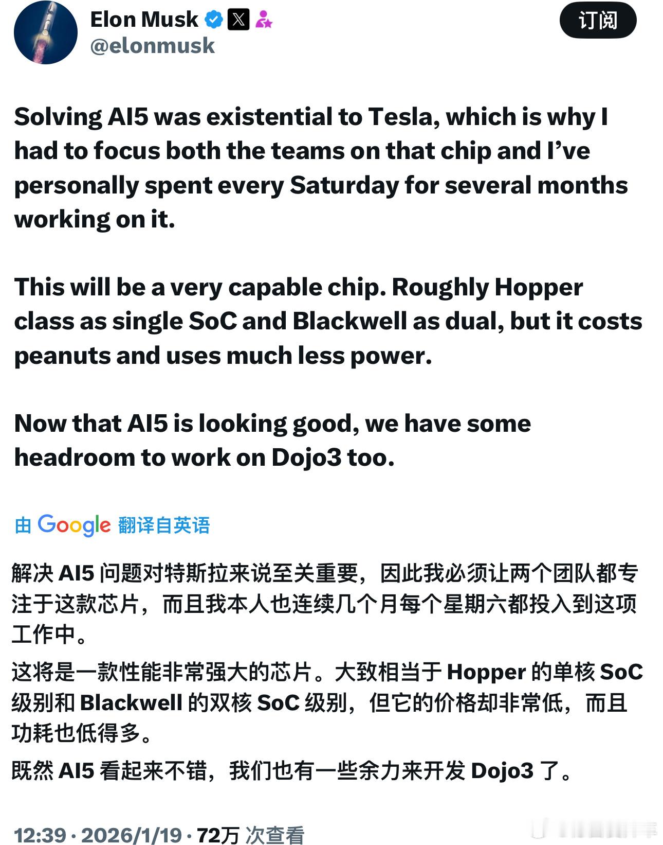特斯拉AI5芯片对标英伟达Hopper架构,Hopper架构的代表产品是英伟达 H100,按FP8/INT8精度算大致3-4000 TOPS,用BF16/FP16精度下也有个2000T算力,而 AI5 主要目的不是来取代英伟达芯片,是为了构建特斯拉汽车车、机器人生态,当然在推理/训练中导入AI x、Dojo芯片。特斯拉