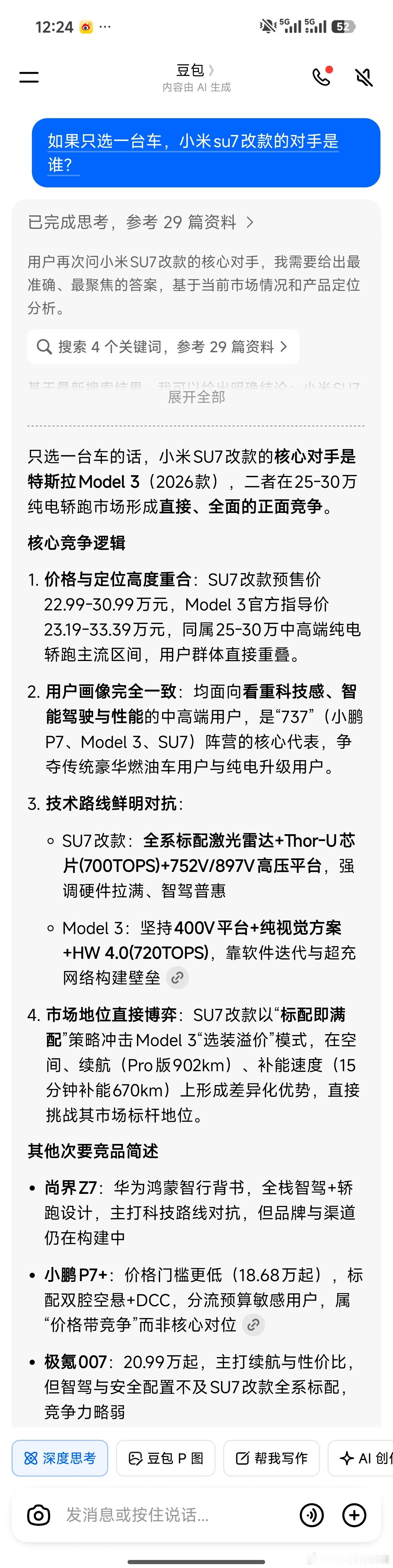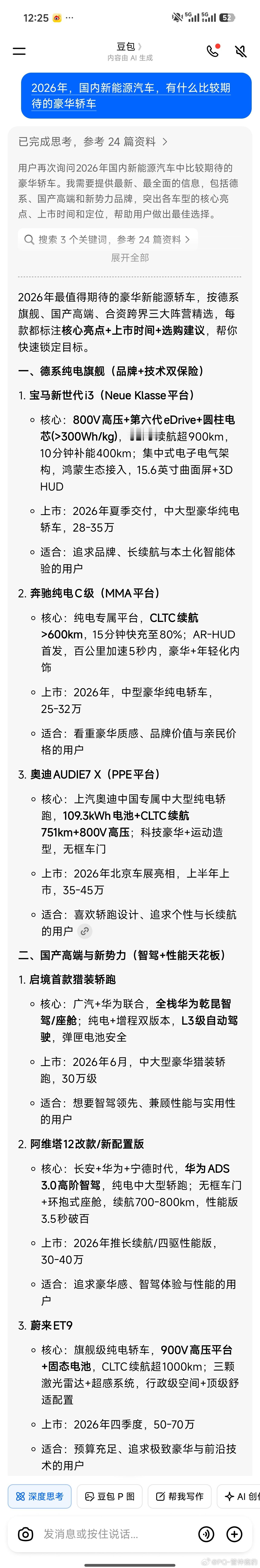豆包预测尚界Z7或成SU7最强对手我的豆包是假的吗第一个问题2026年,国内新能源汽车,有什么比较期待的豪华轿车回答:启境猎装,阿维塔12,蔚来et9第二个问题如果只选一台车,小米Su7改款的对手是回答: Model3