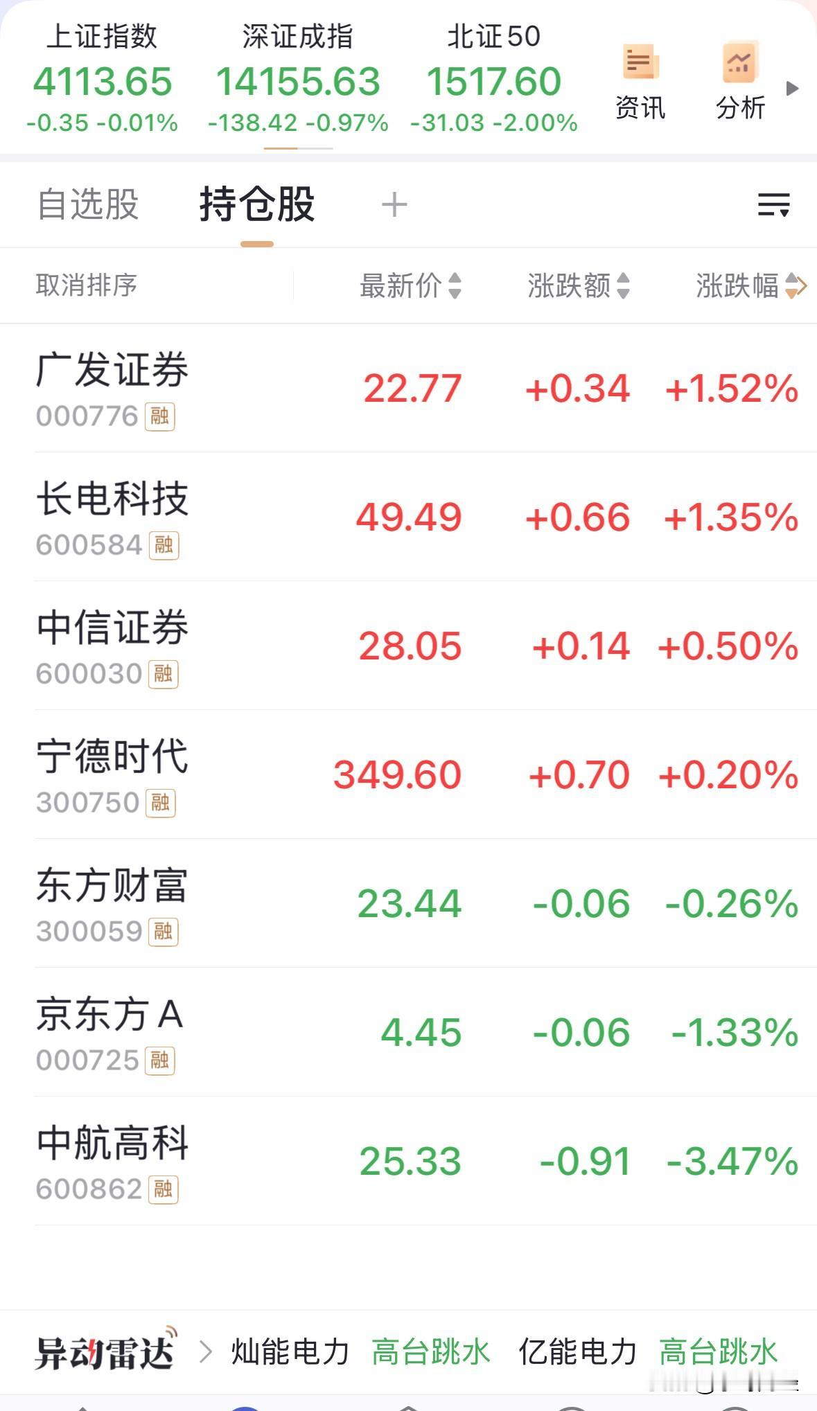 今天还是有挣点的,但几乎是历史的盈亏降到了三位数,这就是在4100点左右纠结的必然现象吧? 其中,广发证券仍然是我心中的大黑,中航高科虽然大涨后迎来大跌,但昨已减了,目前仓位很轻。 而京东方则仍耐心持股中,等待其25年的业绩预告。参考TCL科技,业绩应该不会太差,个人预计在70亿元左右。京东方目前持仓仍浮亏,但也已大幅减亏。 目前指数估计还得纠结几个交易日,仓位不宜过重。 乐呀财经