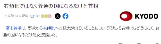 1月19日,高市早苗郑重地说:“日本不会右倾化,我只不过想让日本成为一个正常的国家而已。”据共同社报道,这句话是高市在面对在野党担忧国家右倾化时,她做出的反驳。 她嘴里说的“不会右倾化”,和她正在做的事完全对不上号,所谓的“正常国家”,根本就是包装右倾扩张的幌子。 咱们先把话说明白,高市早苗说的“右倾化国家”到底是啥意思。说白了,就是日本在右翼势力带领下,打破二战后定下的和平宪法,不承认过去的侵略历史,还搞带有侵略性、扩张性的国策,把国家往军国主义的老路上带。 高市早苗嘴上否认右倾化,可每一步行动都在往这个方向使劲,一点都不掩饰。 高市早苗能走到今天这个位置,和日本前首相安倍晋三的提携分不开,她就是安倍的“政治门生”,而安倍本身就是根深蒂固的右翼分子,一门心思要摆脱二战后的体制束缚,让日本重新拥有强大的军事力量。 高市早苗在思想上和安倍一脉相承,甚至比安倍更激进,她的一系列操作,全是右倾化的实锤。 最核心的就是要动和平宪法。1947年施行的和平宪法第九条,明确规定日本永远放弃战争,不能拥有陆海空军等战力,这是制约日本走军国主义老路的关键。 可高市早苗早就把这话抛到脑后,频繁呼吁废除和平宪法里“放弃战争”的条款,还要把现在的自卫队改成“国防军”,这不明摆着要突破宪法限制,重建军队吗? 她上台后,还推动修改《国家安全保障战略》等安保文件,为军事扩张铺路,甚至计划修改《自卫队法》,恢复“大佐”“大尉”等旧日军军衔,故意强化自卫队的军队属性,一步步掏空和平宪法的核心内容。 扩军备战的动作更是越来越明显。以前日本防卫费有明确限制,可高市早苗内阁大幅增加防卫预算,2025财年防卫预算已经达到9.9万亿日元,占GDP的1.8%,后来通过补充预算调整,占比直接提升到2%,提前两年实现了原定2027年才达成的目标。 这笔钱不是用来防守的,而是要发展“对敌基地攻击能力”,说白了就是能主动打击其他国家的军事目标,这已经完全背离了和平宪法规定的“专守防卫”原则。 在军事部署上,日本也动作不断。2025年3月,防卫省正式成立“统合司令部”,统一指挥陆、海、空自卫队以及太空、网络等新型作战力量,遇到紧急情况能直接向部队下命令,明显是在构建进攻性的军事指挥体系。 同时还在建设地下抗毁指挥所,研发高速滑翔弹、无人作战系统,甚至暗示要研发核动力潜艇,这些都是妥妥的扩张性军事举措。 更离谱的是,高市早苗还在推动放宽武器出口限制,计划2026年上半年彻底废除相关规定,让战斗机、导弹等主战装备能对外出口,这意味着日本的军工复合体要复活,靠卖武器赚钱,进一步助推军事扩张。 在历史问题上,高市早苗的右翼立场更是毫不掩饰。她频繁参拜靖国神社,而靖国神社里供奉着二战甲级战犯,这本身就是对侵略历史的美化和否认,是典型的历史修正主义。 二战后国际社会明确规定,日本要承认侵略历史,可高市早苗这类右翼政客,就是想通过参拜靖国神社、修改历史教科书等方式,淡化侵略罪行,让日本年轻人忘记过去的战争罪责,为右倾化铺路。 她还把手伸到了中国台湾问题上,公然干涉中国内政,这也是右倾扩张的重要表现。去年11月,在国会审议中,高市早苗明确表示,“台湾有事”如果伴随武力行使,可能构成日本的“存亡危机事态”。 按照日本2015年的新安保法,一旦认定为“存亡危机事态”,日本就能行使集体自卫权,派军队到海外作战。这话说白了,就是暗示如果台海出现冲突,日本会军事介入,完全违背了一个中国原则,也突破了日本以往政府的表态底线。 更可笑的是,她一边搞这些右倾操作,一边在1月19日宣布解散众议院,提前举行大选。 上次众议院选举才过去1年3个月,远远没到4年的任期,她这么做,就是因为自民党在国会两院都没占过半数议席,想通过大选巩固权力,为后续推进修宪、扩军等右倾政策扫清障碍。 这个决定在日本国内引发了巨大争议,数百名民众聚集抗议,认为她制造“政治空白”,不顾民众生活,在野党也强烈批评她此举毫无正当性,完全是为了一己私利绑架国家。 高市早苗嘴里的“正常国家”,根本不是什么回归常态,而是要摆脱二战后国际社会对日本的制约,打破和平宪法的束缚,让日本重新拥有进攻性军事力量,甚至重拾侵略扩张的旧梦。 她否认右倾化,可每一件事都在践行右倾国策,从修宪、扩军,到否认历史、干涉他国内政,没有一样不是在往危险的路上走。
