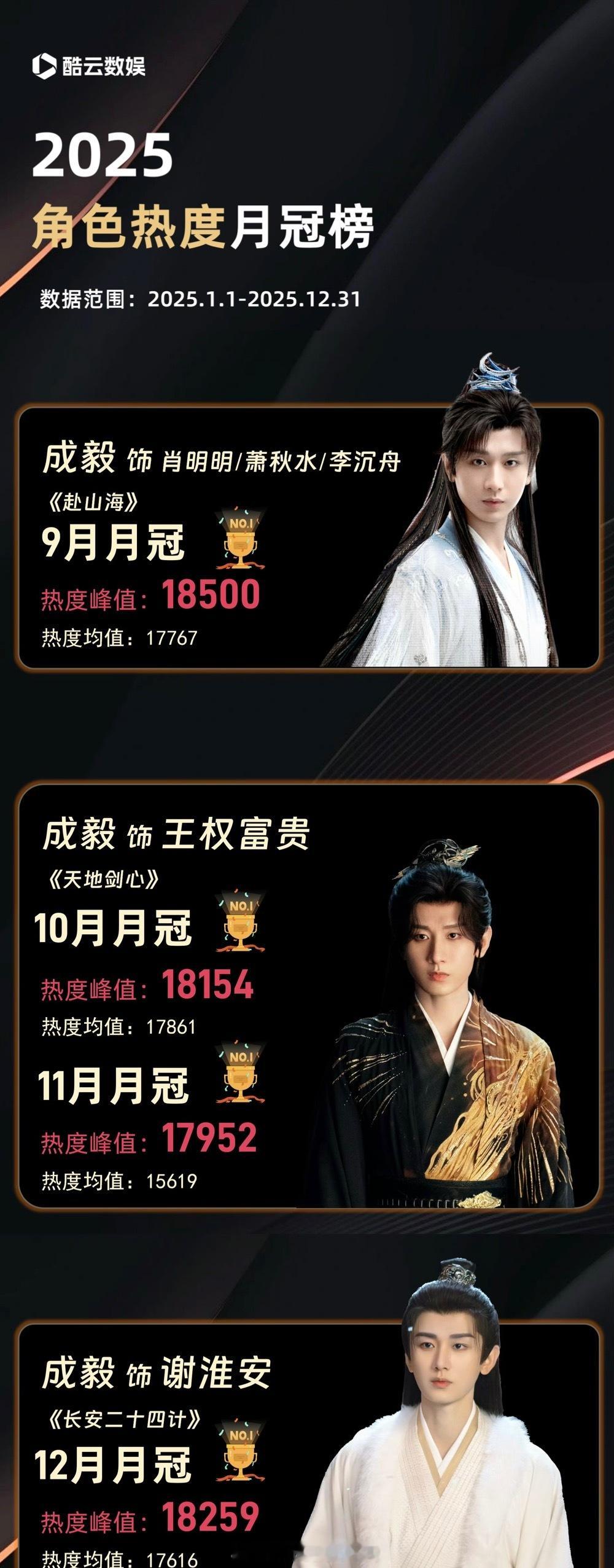 2025酷云角色热度月冠榜成毅拿下9、10、12月月冠榜冠军🏆