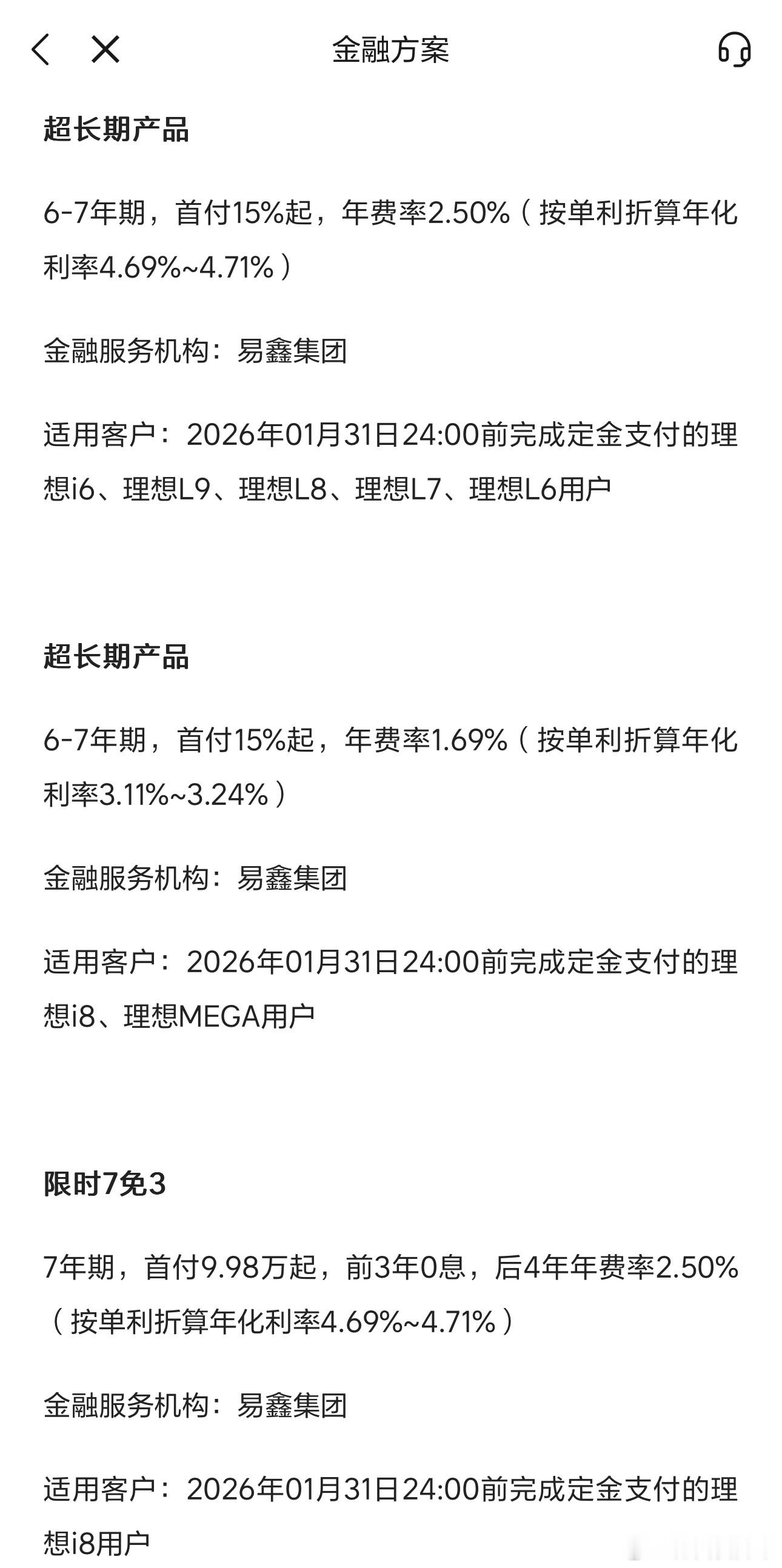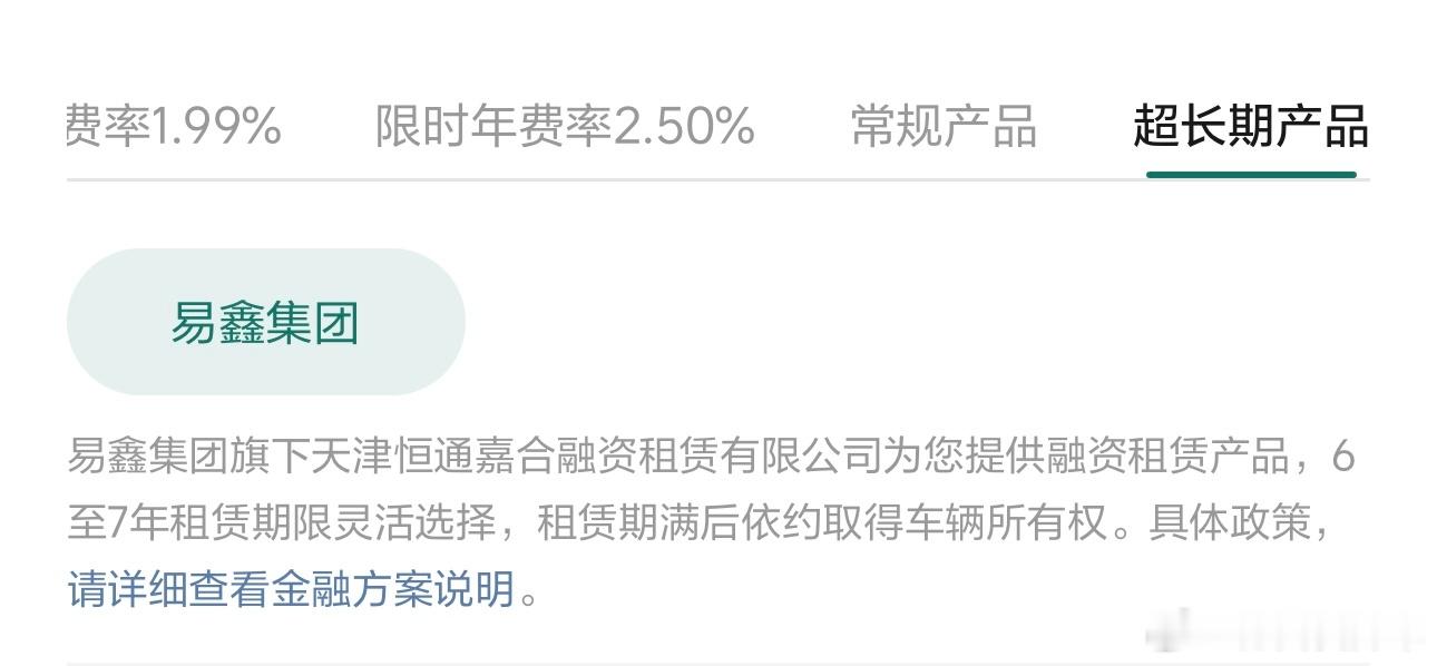 其实两个月前理想门店端已经有 7 年超长贷了,今天理想汽车算是正式官宣推出 7 年超长贷,和易鑫集团合作,年费率为1.69%-2.5%;看金融公司描述这应该是融资租赁性质?本月特斯拉也推了 5 年0息、7年低息,年费率分别为0%、 0.5%、0.7%。理想汽车新能源汽车