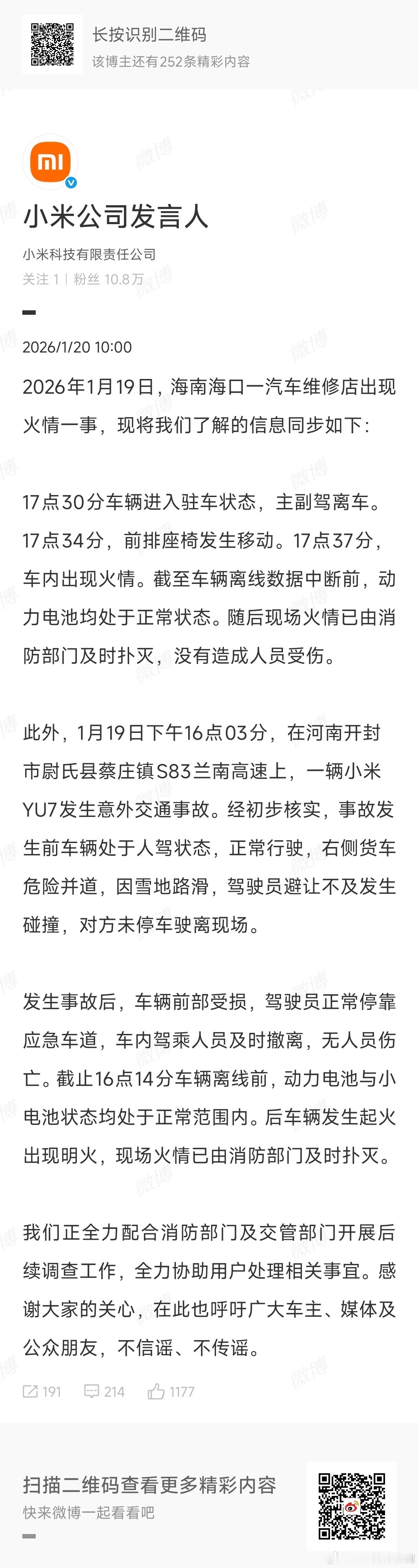 小米通报海南一汽车维修店火情【省流版】第一起: 海口维修店火情事件1月19日17点30分,涉事车辆进入驻车状态,主副驾人员离车;17点34分前排座椅发生移动,17点37分车内出现火情。截至车辆数据离线前,动力电池状态正常。火情已由消防部门及时扑灭,无人员受伤。第二起: 开封高速事故起火事件1月19日16点03分,一辆小米YU7在河南开封兰南高速正常行驶(人驾状态),因右侧货车危险并道,加之雪地路滑,驾驶员避让不及发生碰撞,货车驶离现场。事故后车辆前部受损,驾乘人员及时撤离至应急车道,无人员伤亡。截至16点14分车辆数据离线前,动力电池与小电池状态均正常,后续车辆发生起火,火情已由消防部门扑灭。