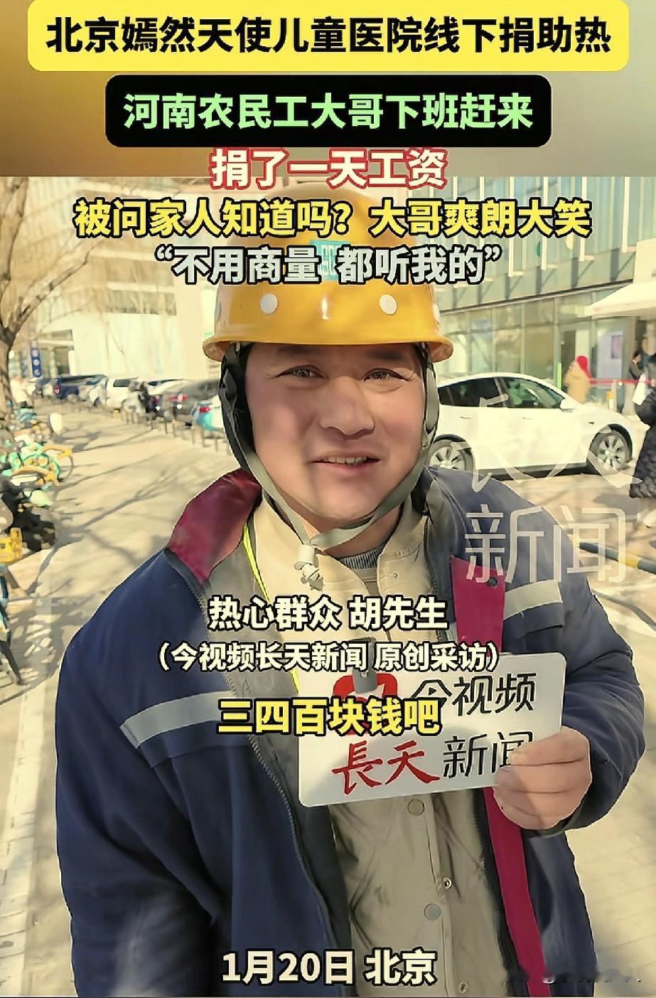 看哭了!河南一农民工大哥,下班后跑到李亚鹏的嫣然医院,把自己在工地干一天活挣的三四百块钱捐了,大哥随后的一番话令人泪目。 这位农民工大哥是在北京一个工地干活,当他得知李亚鹏和医院的事情后,他在下班的时候来到了医院。 大哥辛苦干一天活挣的三四百块钱,全部都捐给了医院,大哥出了医院大门后,碰到了记者采访。 记者问他给医院捐钱用不用给家里人商量,大哥笑着说不用商量,家里人全听我的。 除了这位大哥外,北京当地的很多居民也去到了嫣然医院,她们有的捐钱,有的带着牛奶,面包送往医院。 “这个医院不能倒闭,那里的孩子们太可怜了,这是一件大善事”,一位大妈在采访时哭着说道。 无论是线上捐赠的网友,还是线下捐助的群众,他们代表着千千万万的老百姓真实的想法。 李亚鹏先生坚持了一二十年的善举,老百姓托也得给他托起来,不能让做好事的人寒心!