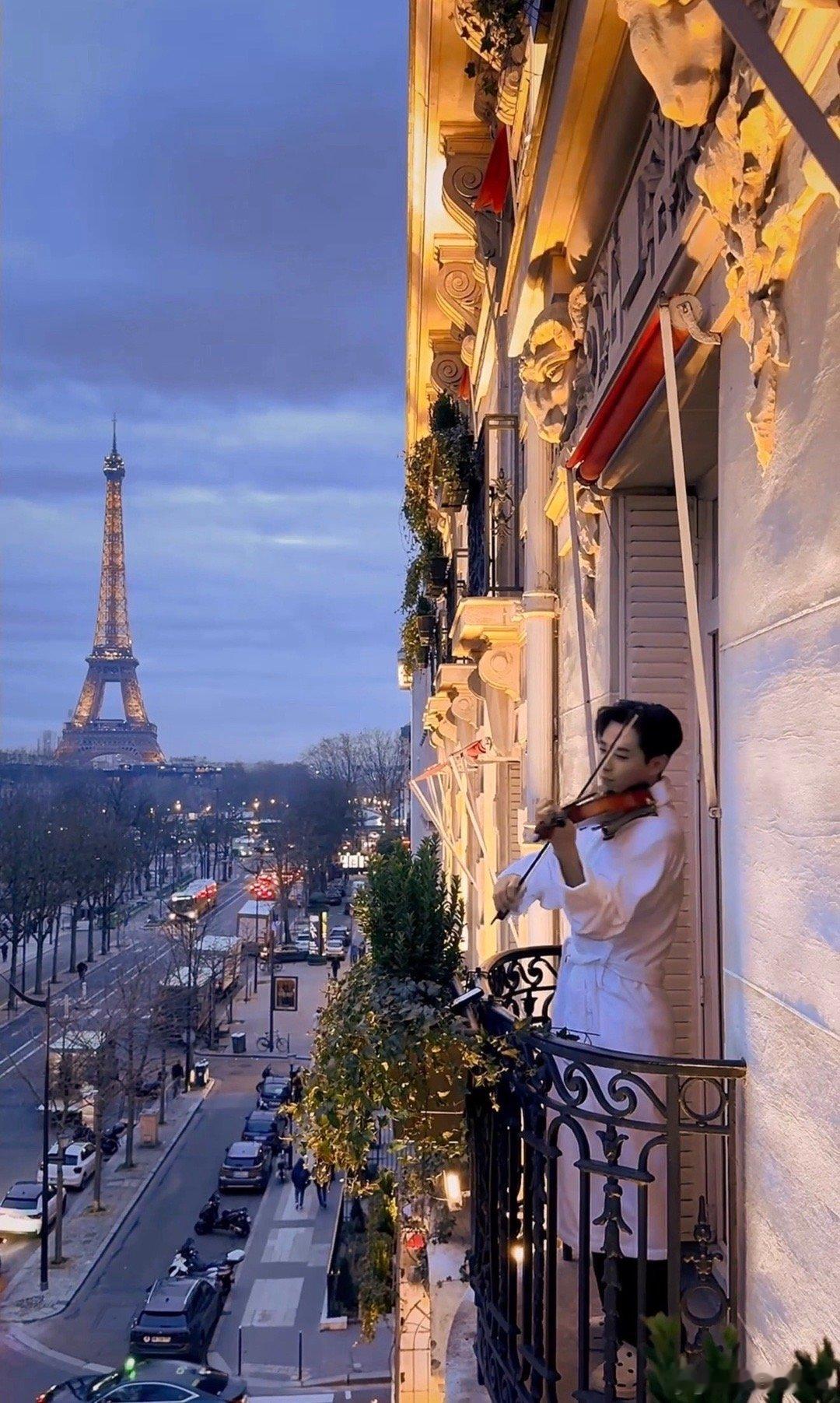 刘宪华穿着浴袍在阳台拉琴 视频将音乐与城市夜景完美融合。琴声仿佛融进了夜色里,远处的灯光成了最自然的舞台背景,整体效果非常和谐。