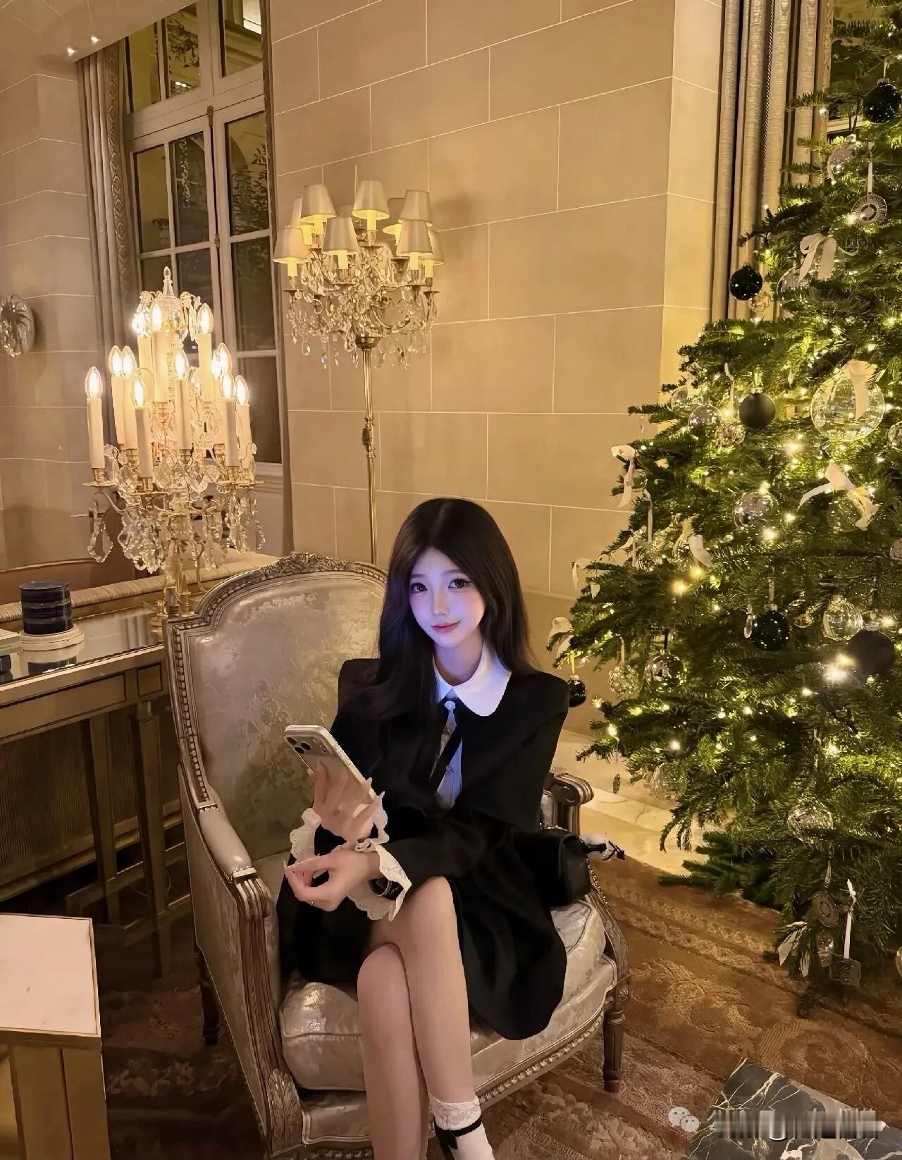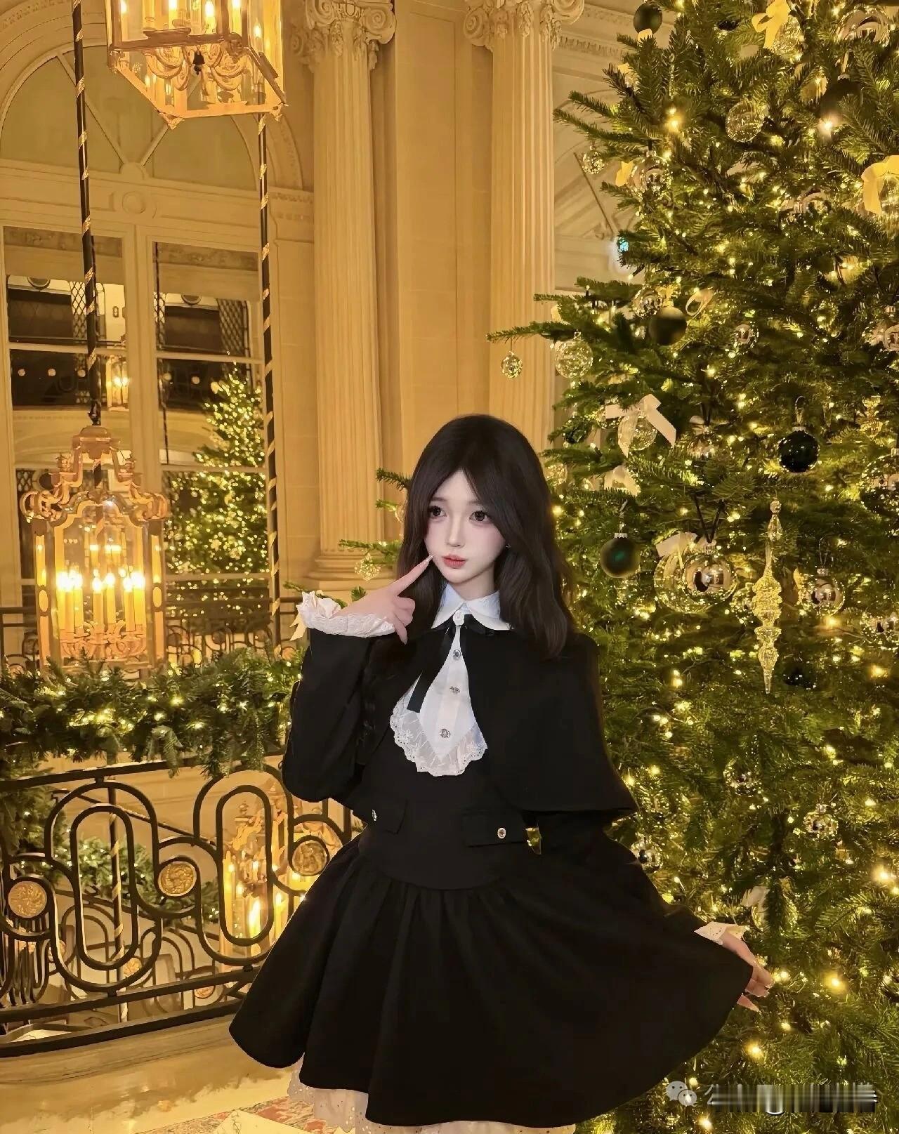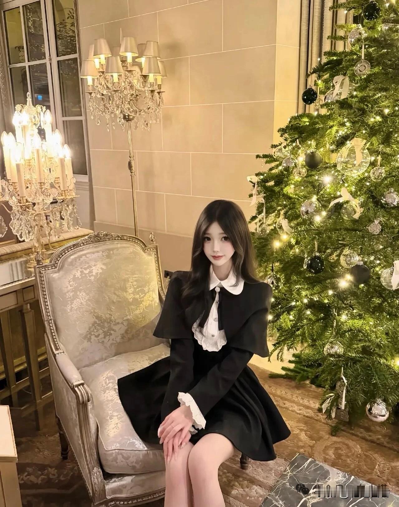 优雅黑裙少女,圣诞树旁静坐,梦幻氛围满满🎄✨