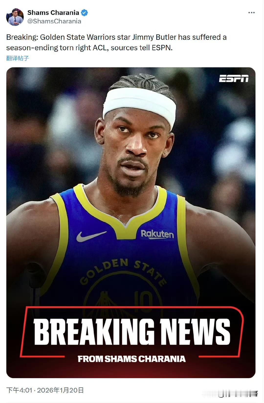 勇士没了!!!巴特勒右膝前交叉韧带撕裂,赛季报销! 根据记者Shams最新消息