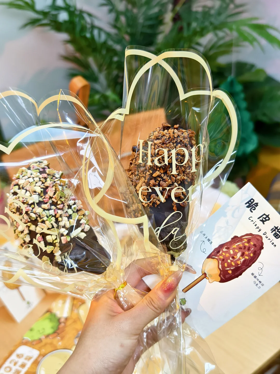 本期最爱惊喜✨!清脆的黑巧外壳“咔哒”裂开,里面是冻得像雪糕的苏丹王榴莲果肉,冰爽浓醇还带着脆脆口感,冷热交融好奇妙~