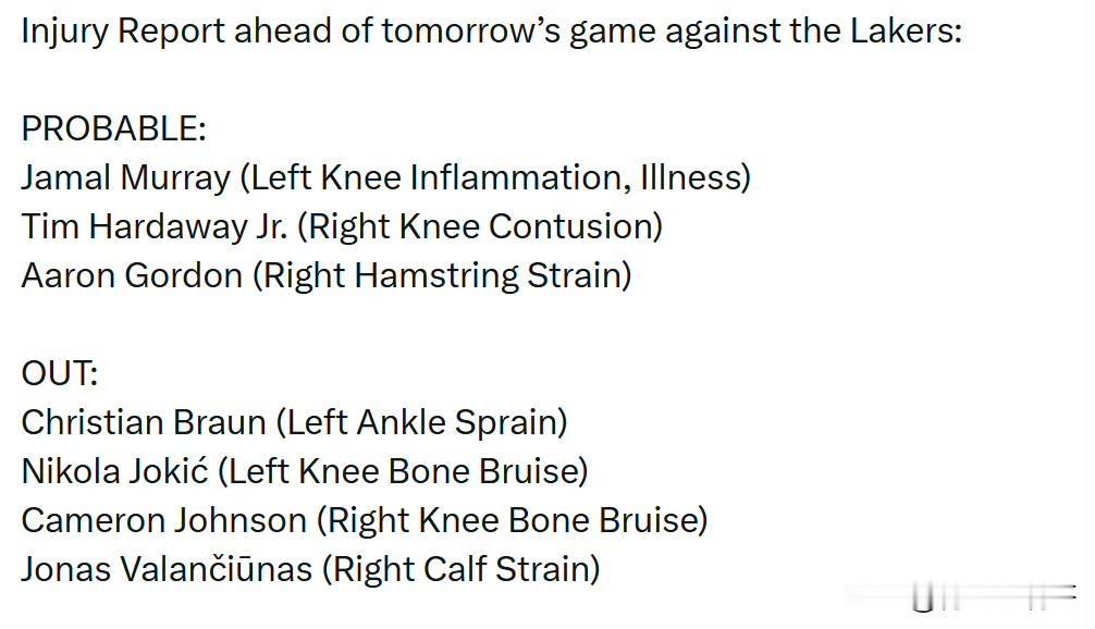 湖人vs掘金比赛预告!!!湖人对阵掘金比赛预测,湖人被看好! 北京时间1月21号周三上午11点,湖人将开启自己的客场之旅,首个对手就是熟悉的掘金队,双方的恩怨就不用多说了,一起来看下比赛预告吧。 湖人伤病情况: 里夫斯和蒂耶罗继续缺阵不打,其他球员都可以出战。 掘金伤病情况: 掘金伤病较多,布劳恩、约基奇、老黄忠约翰逊和瓦兰都不能打,穆雷、哈达威和戈登预计大概率可以出战。 目前,从ESPN给出的预测结果来看,湖人以超过六成的胜率被非常的看好,毕竟没有了约老师掘金整体实力还是下降不少的,不过穆雷和戈登依然不容小觑。 这是湖人八连客的第一场,看看他们能否跨过掘金开个好头吧。 湖人 nba 湖人 湖人赛程