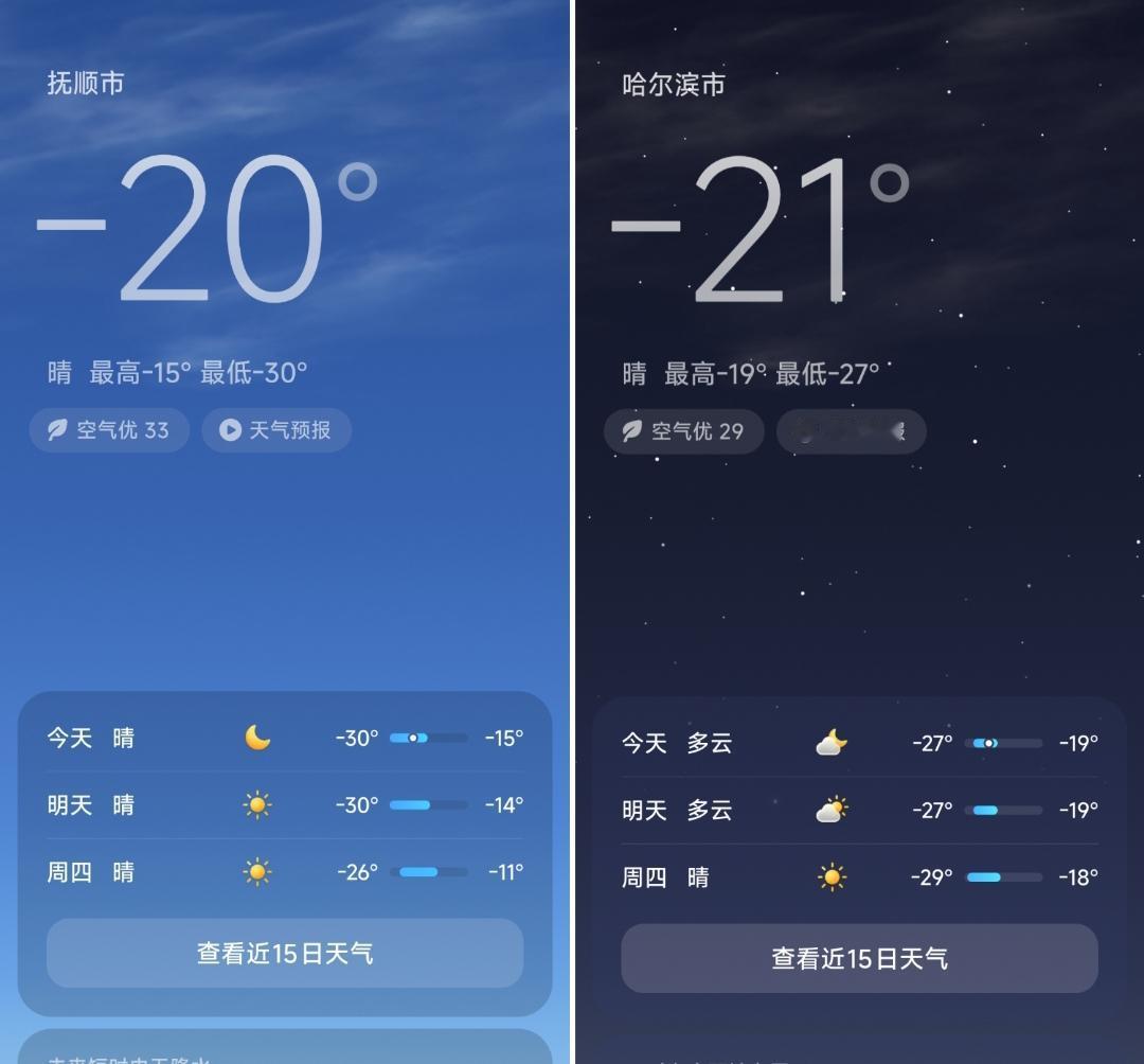 此时此刻抚顺是-20℃,哈尔滨是-21℃,明天与后天抚顺的天气竟然比哈尔滨冷很多,见此情景不禁感慨最近几天辽宁省的天气确实是冷的如同黑龙江。 令人欣慰的是从2月2号开始辽宁省的天气逐步恢复到-3℃到-12℃之间,见此情景不禁感慨临近春节之际辽宁人在户外赶大集买年货不会有任何影响。