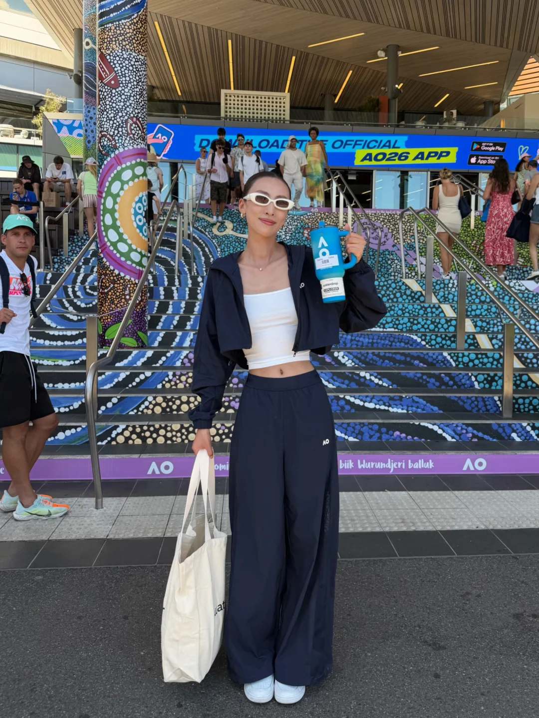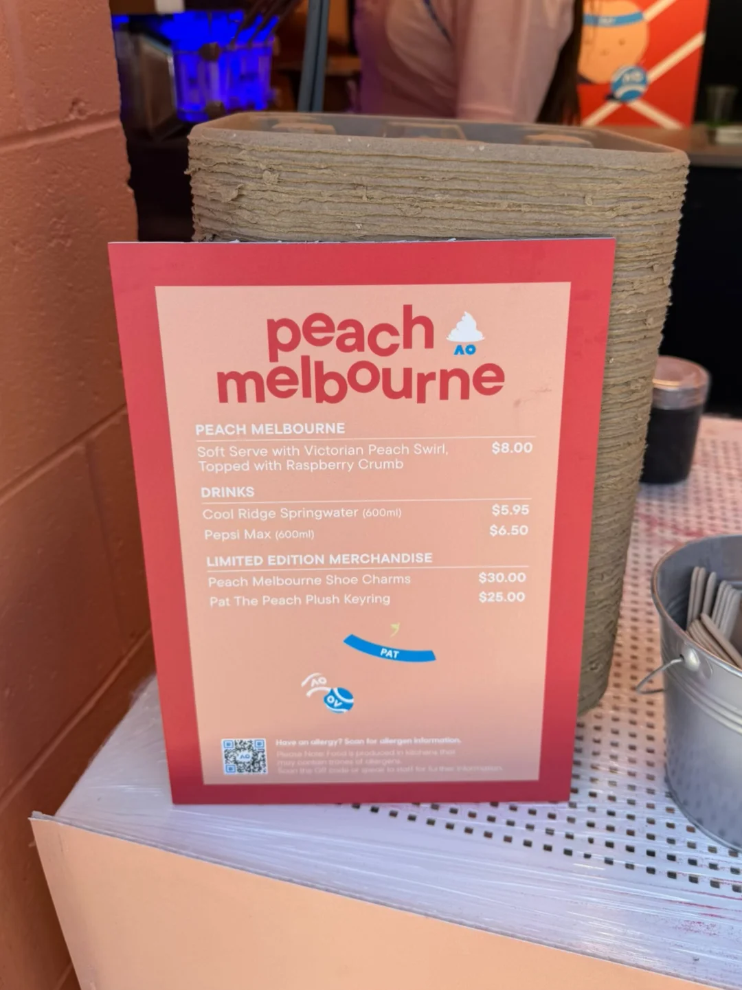澳网第一天 看了紫薇和张之臻 还拿到了刻了我名字的水杯 墨尔本真的热(据说上周更热🔥 今天接受了澳网官方的活动 寻找最能代表澳网的美食 必须是桃子味的冰激凌 上午来的比较早 看到蜜桃冰淇淋没人排队立刻买了一个 也属于很有标志性的澳网必吃系列 早上12:00前应该都没什么人排队 之后就真的人山人海了 🍦peach melbourne 💦waterdrop