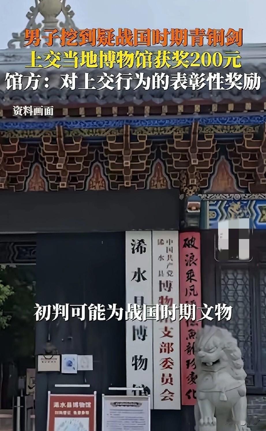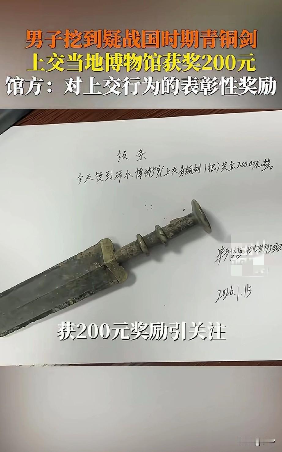 男子在工地上班,意外挖到了战国时期的青铜剑!于是拍视频进行了炫耀! 随后就有当地的博物馆工作人员联系他,要求他立刻上交,因为这很有可能是国家的文物! 但是由于工作比较忙,所以一直没有去上交,博物馆的工作人员就天天给他打电话骚扰,还给他发短信! 劝他不要犯糊涂,地里挖到的青铜器是国家的人物,一定要上交,可千万不能卖了! 不胜其烦的男子,这才请假去把青铜剑上交了,经过当地博物馆的工作人员鉴定,这把剑确实是战国时期的青铜剑! 当场给他奖励了200元,最后他拿着这200元就加了一箱油,当地博物馆的工作人员根据他的描述! 立刻抽出攻坚力量,前往挖到青铜剑的工地,挖了几天之后,什么也没有,白白浪费了几天的劳动力, 本以为可以获得重大发现,忙了一大场结果却是一场空!这事因为男子发到网上! 我引起了各大媒体纷纷报道,博物馆立刻回应,男子确实捡到了战国时期的青铜剑,并上交,这200元是奖励给他个人的!并不代表青铜剑的价值! 大家对于男子捡到战国青铜剑被奖励了200元,这事怎么看?