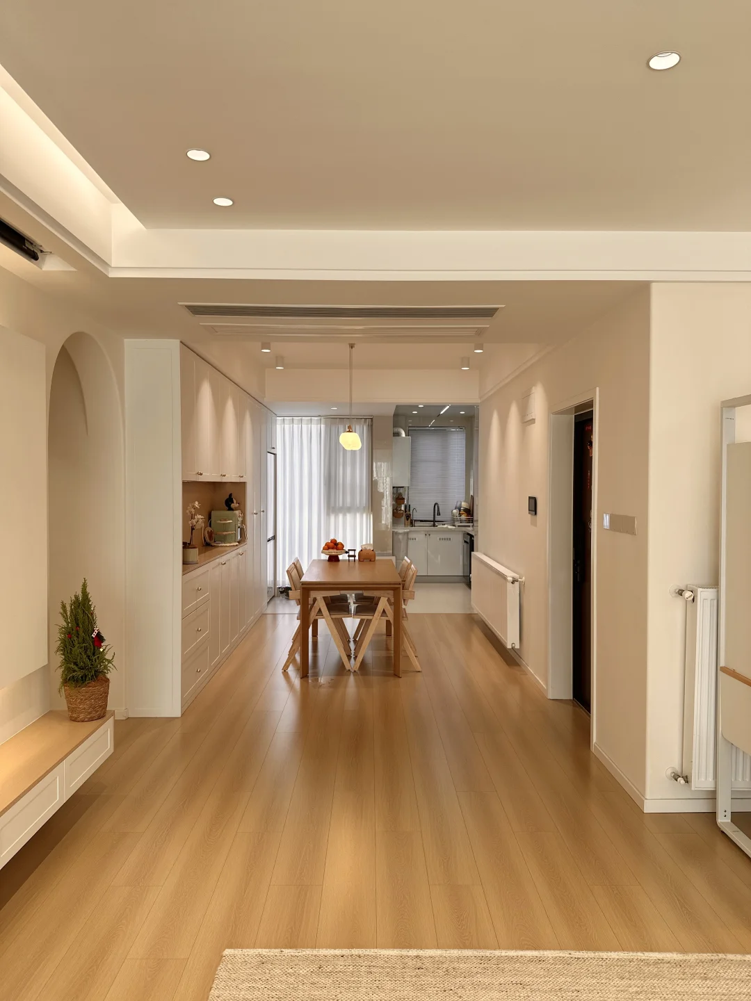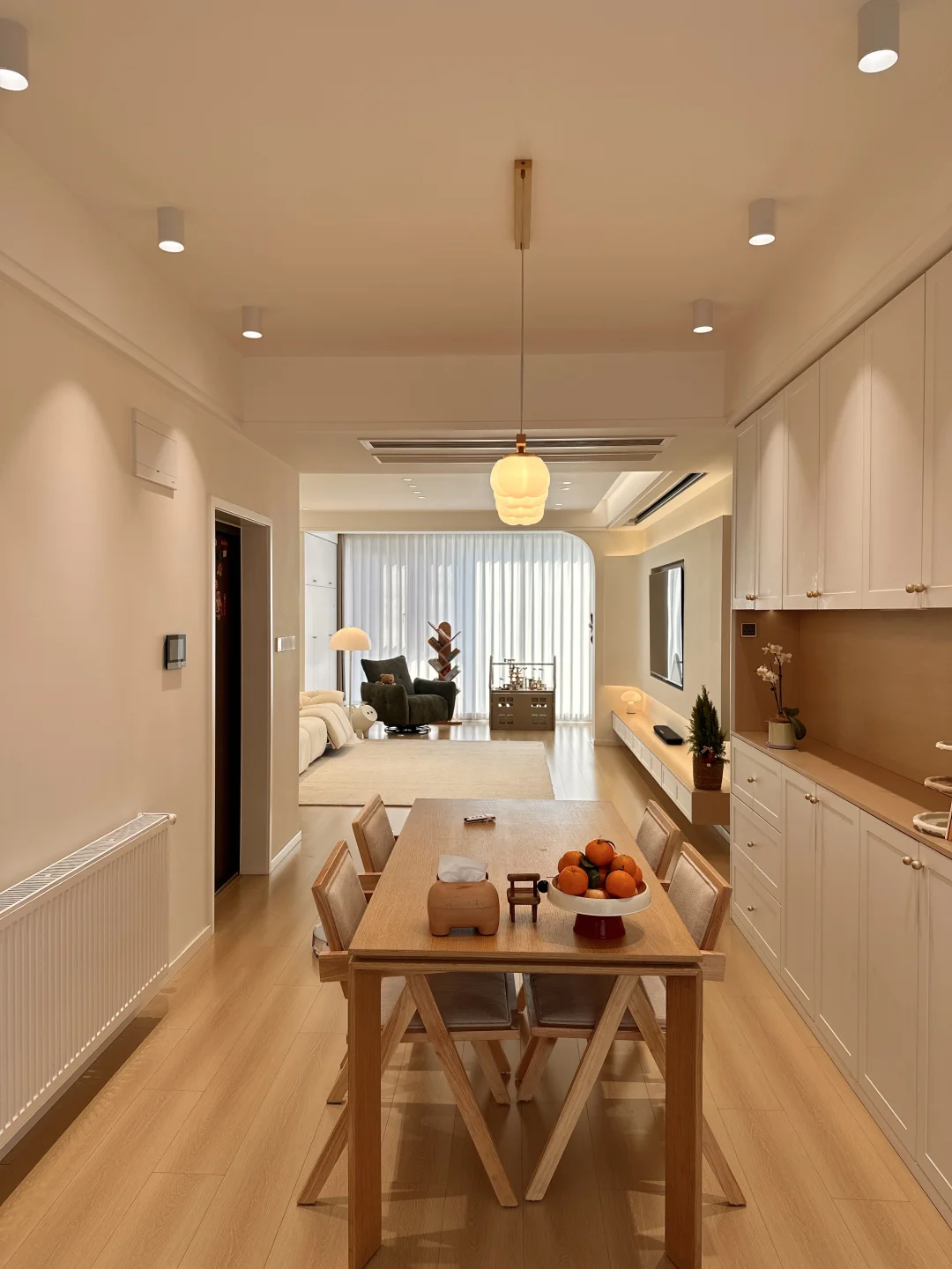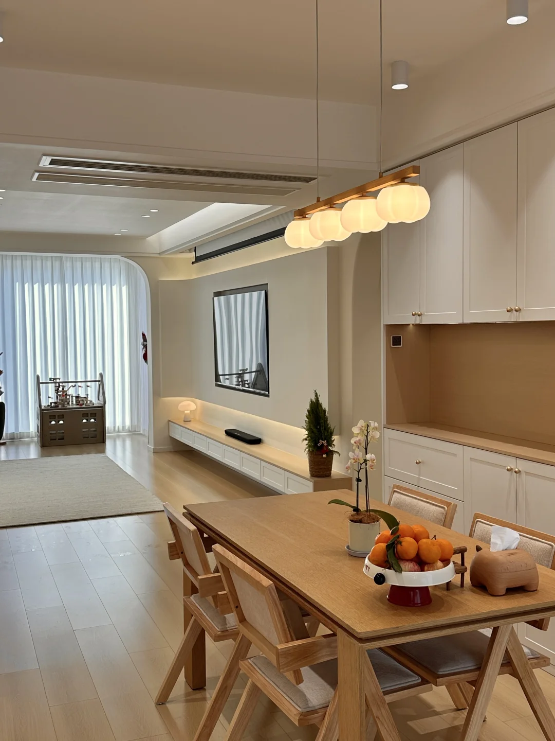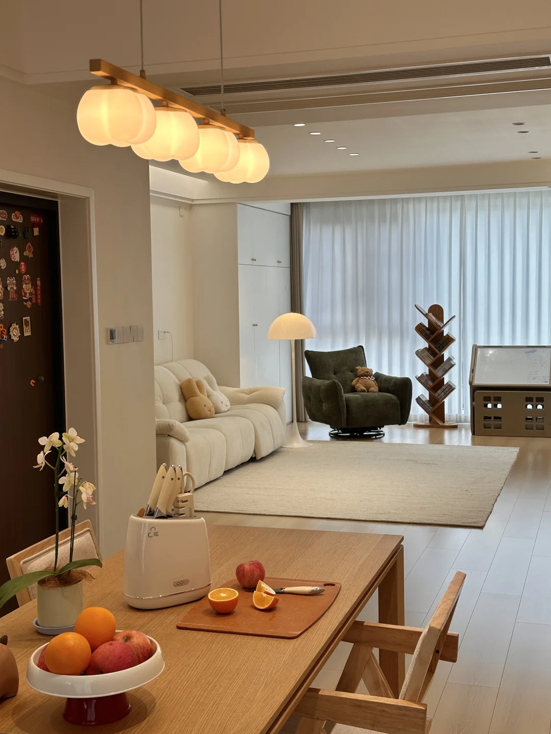 一家三口在小县城拥有一个套内108的小家,极简原木风,暖色调温馨又耐看~ 整体布局没有过多的改动,客餐厅一体的设计,客厅无主灯明亮还显大,温柔的麦浪羊毛地毯,奶呼呼的沙发,餐厅一整套原木风餐桌椅,搭配小棉花吊灯,我的小家在发光耶~