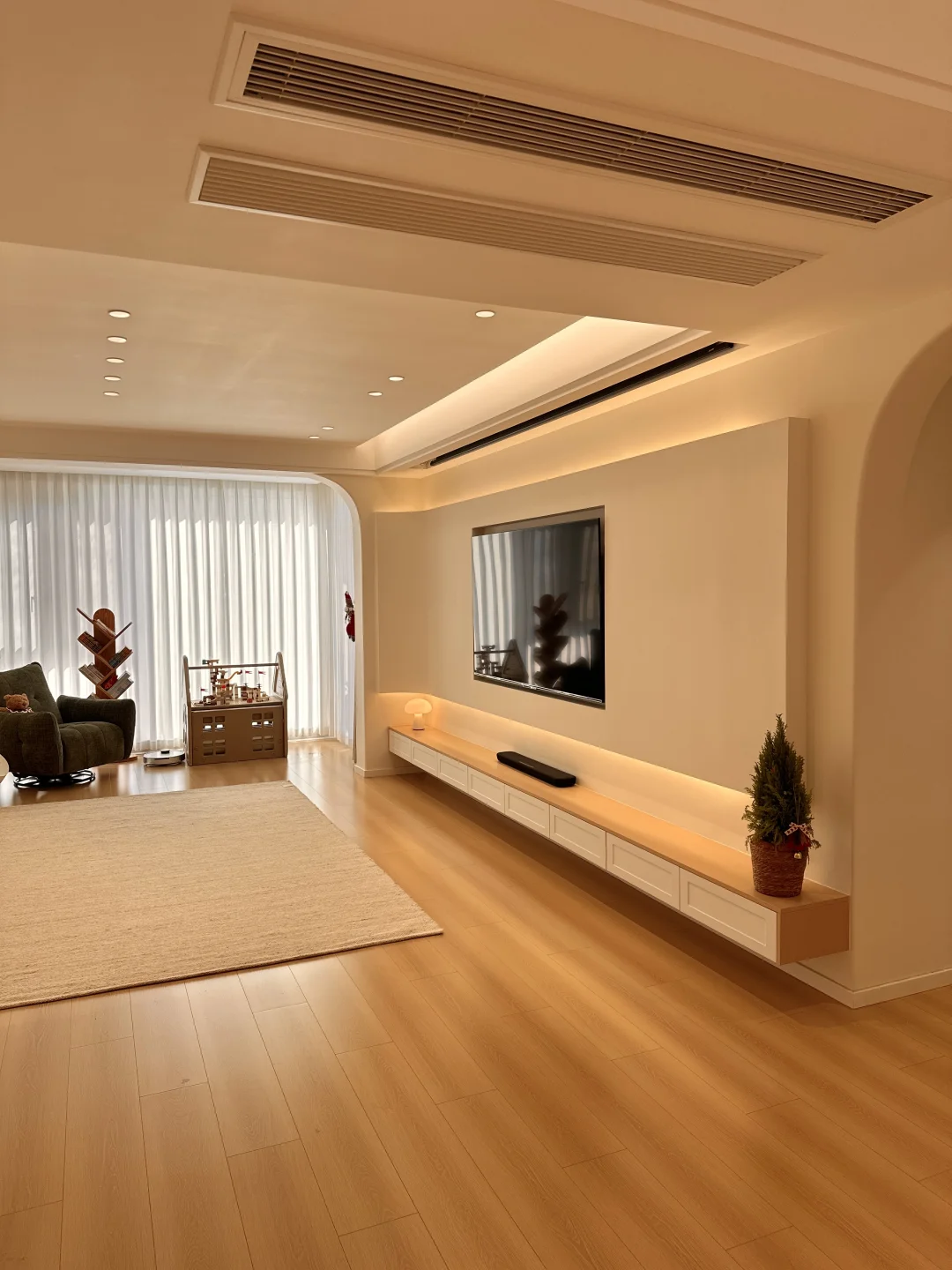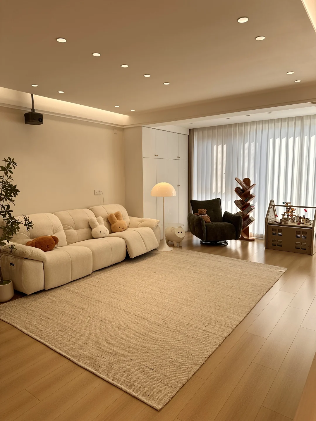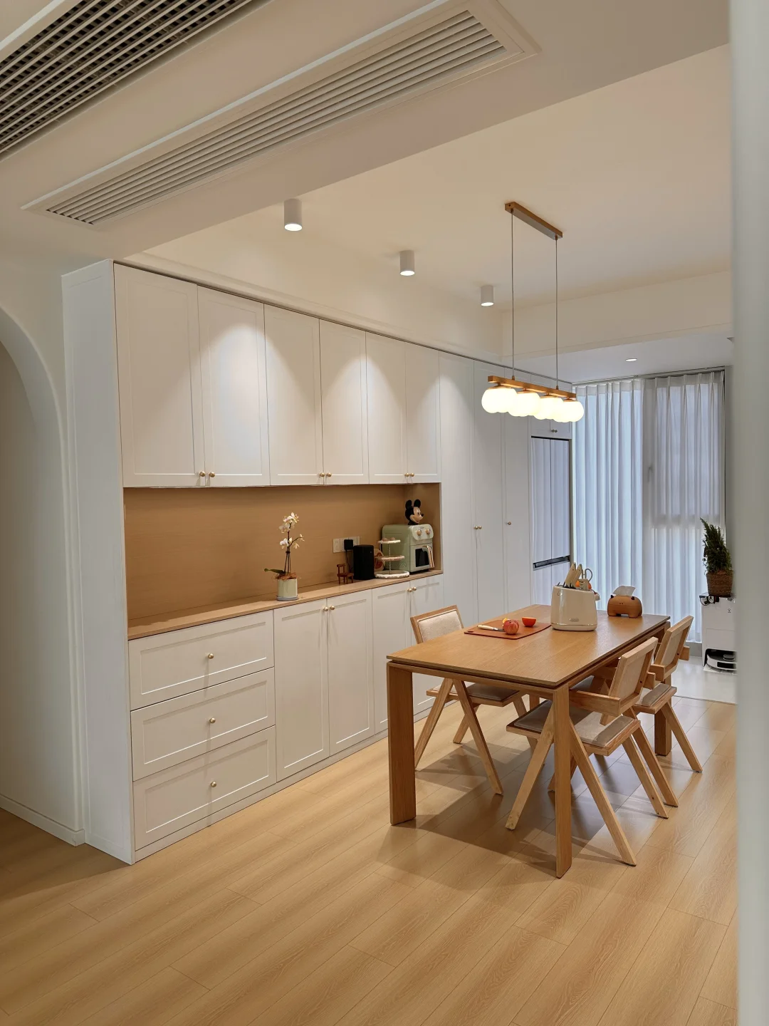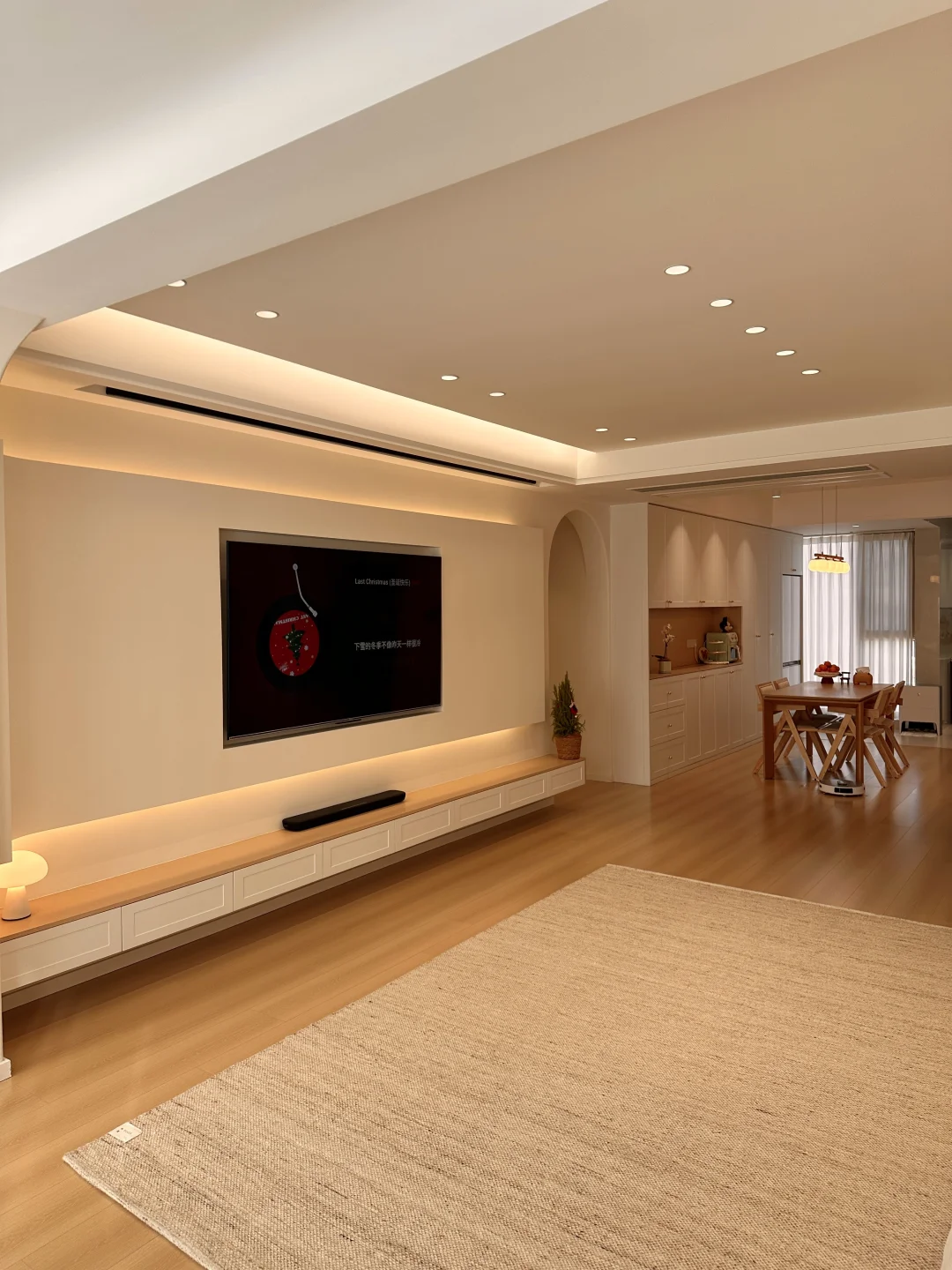 一家三口在小县城拥有一个套内108的小家,极简原木风,暖色调温馨又耐看~ 整体布局没有过多的改动,客餐厅一体的设计,客厅无主灯明亮还显大,温柔的麦浪羊毛地毯,奶呼呼的沙发,餐厅一整套原木风餐桌椅,搭配小棉花吊灯,我的小家在发光耶~