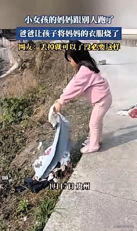 婚姻破裂,别让孩子买单 贵州这位爸爸的做法,真的让人没法认同!老婆离家,自己心里再难受,也不能让五六岁的女儿去烧妈妈的衣服啊。孩子啥也不懂,只知道听话照做,可这种场景带来的伤害,可能会记一辈子。 婚姻走不下去是大人的事,最无辜的就是孩子。不管是女方离家还是男方赌气,都不该把孩子当成发泄情绪的工具。 网友说得对,衣服扔了就行,何必用这种极端方式,给孩子心里留下阴影? 夫妻缘尽可以好聚好散,哪怕做不到祝福,也该守住对孩子的底线。你觉得遇到这种事,该怎么减少对孩子的伤害?