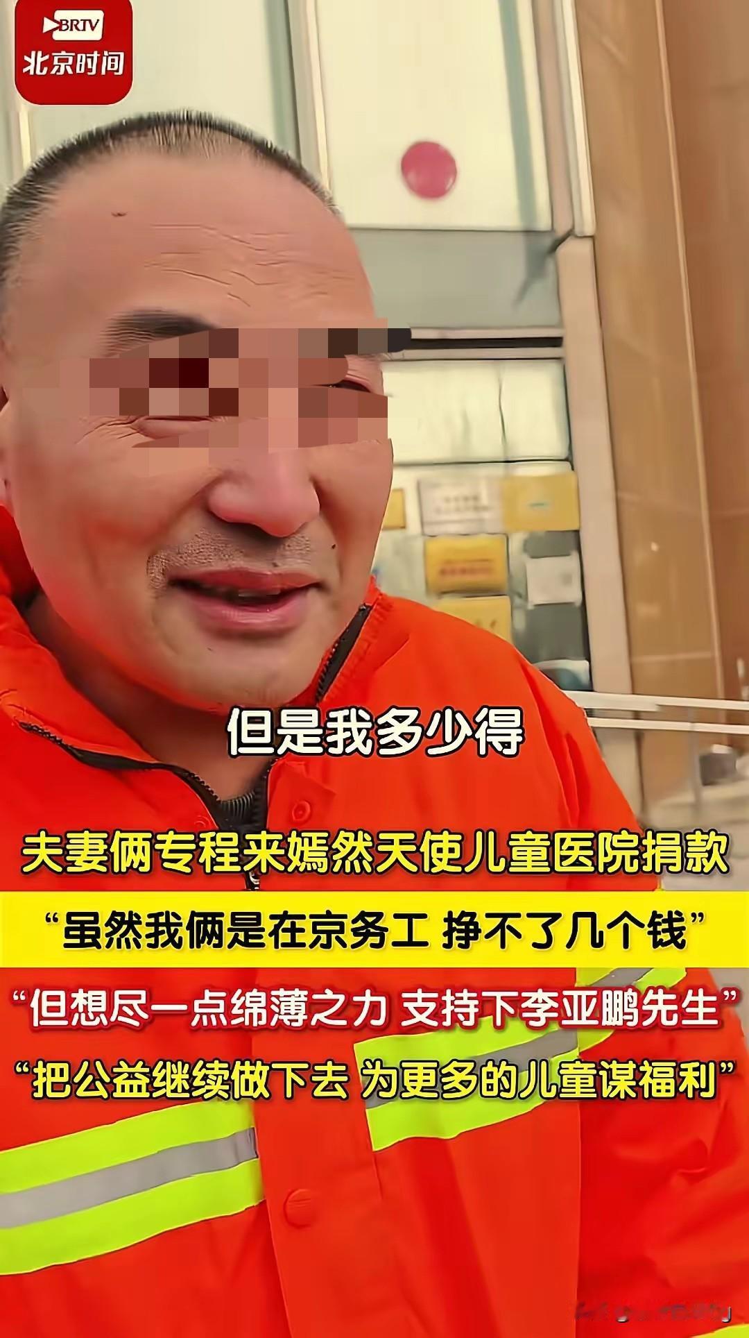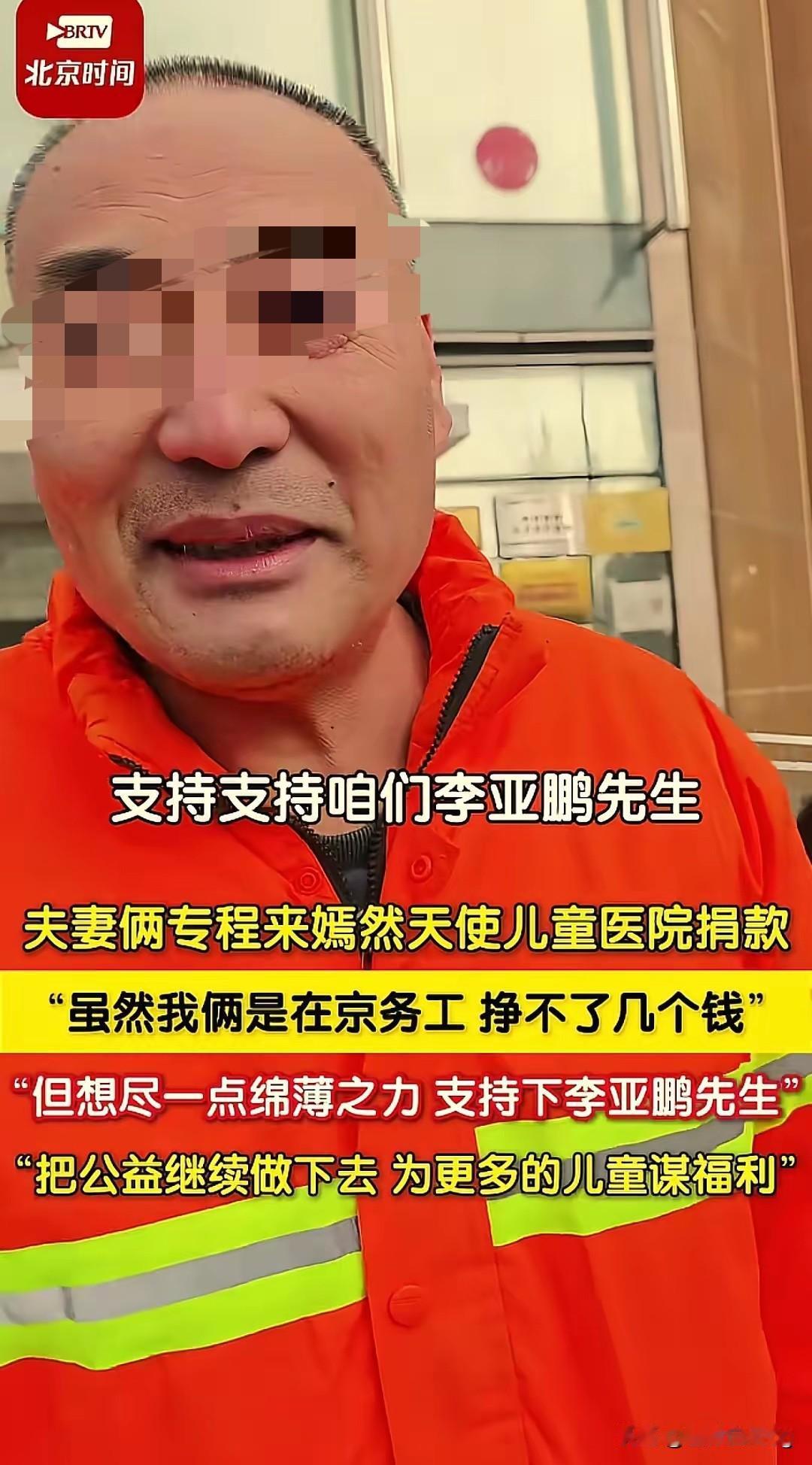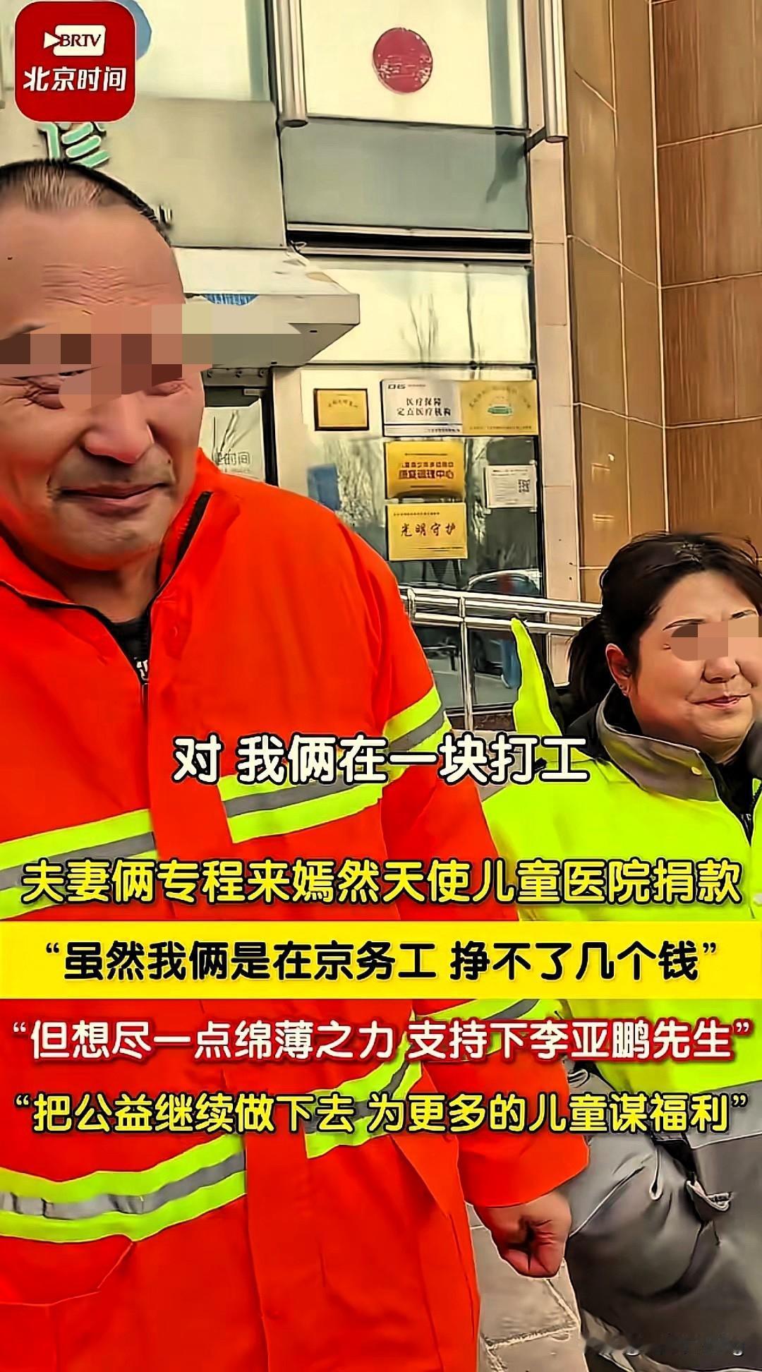 打工夫妻的捐款,才是公益最暖的样子! 北京这对园林绿化夫妻,真的把善良刻进了骨子里!顶着寒风请假赶去嫣然医院捐款,挣的是风吹日晒的辛苦钱,却执意要为陌生孩子尽绵薄之力,一句“支持李亚鹏先生”,满是对十年公益的真心认可。 公益从不是富人的专属,这对夫妻用行动证明:善良和财富无关,和身份无关。 他们捐的钱可能不多,但这份“宁愿少挣一天工钱也要到场支持”的诚意,比任何大额捐款都更打动人。真正的公益,就是普通人愿意为陌生人伸出援手,是人与人之间最纯粹的善意流动。 你有没有被这样平凡人的善举温暖过?