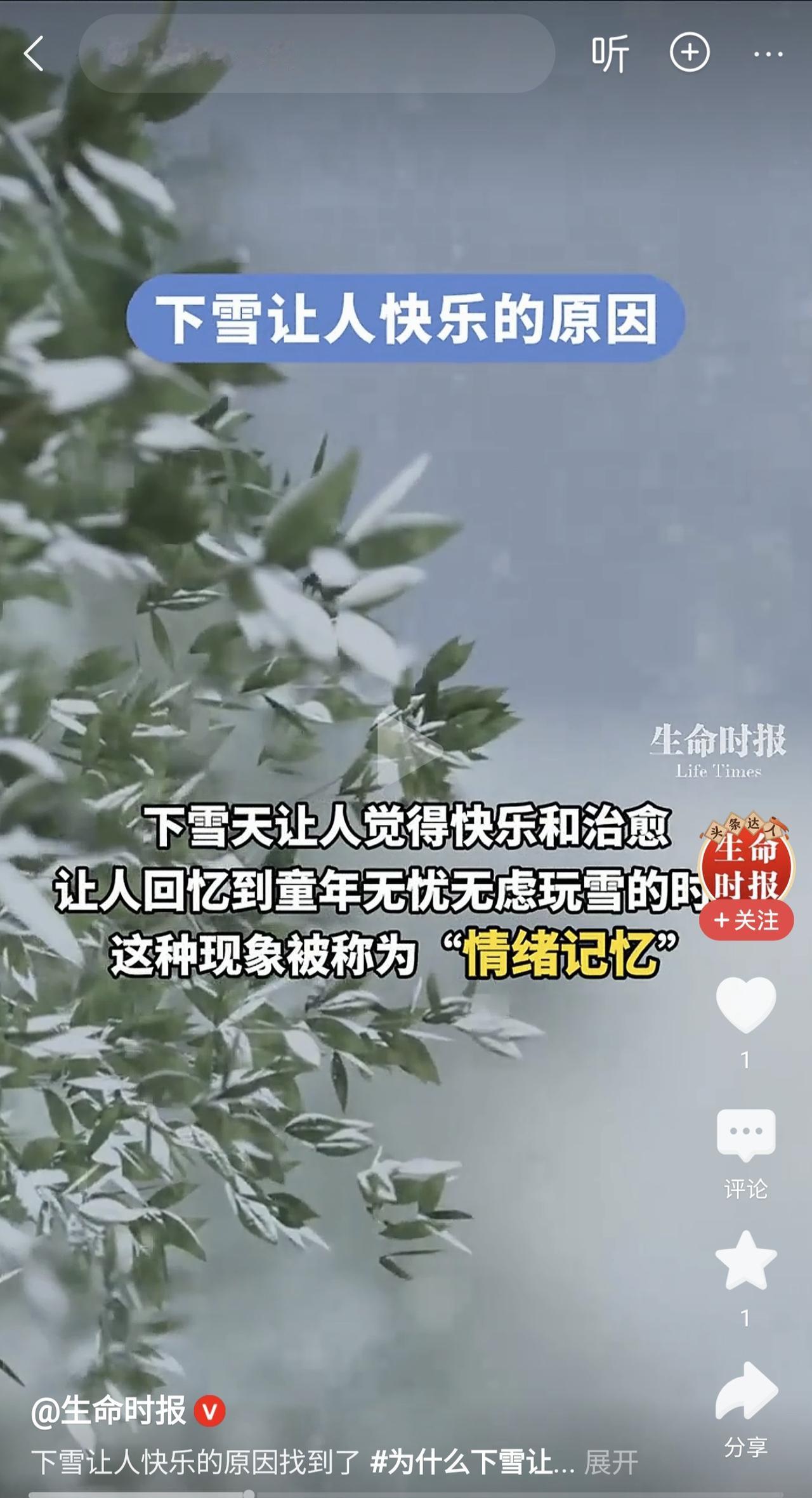 雨雪天气让人感到快乐的真正原因是来自于我们的原始人类基因。 刷到一个视频,说下雪为什么会让人感到快乐,视频里有两个观点,一个是美国一家大学的研究认为很小的物体大量重复时会让大脑产生舒适感,另一个原因是下雪天会让人回忆到童年玩雪的快乐时光。 我觉得远不止如此,想象一下原始人类的生存环境,雨雪给他们带来了丰沛的水资源,加之雨雪天气因无法劳作就可以待在洞穴里休息,带来了难得的安全感,这一点原始基因被我们遗传下来了。当我们在家里或者办公室中,看着窗外漫天飞雪或者瓢泼大雨,心里是不是也会感到一种莫名的安全感。
