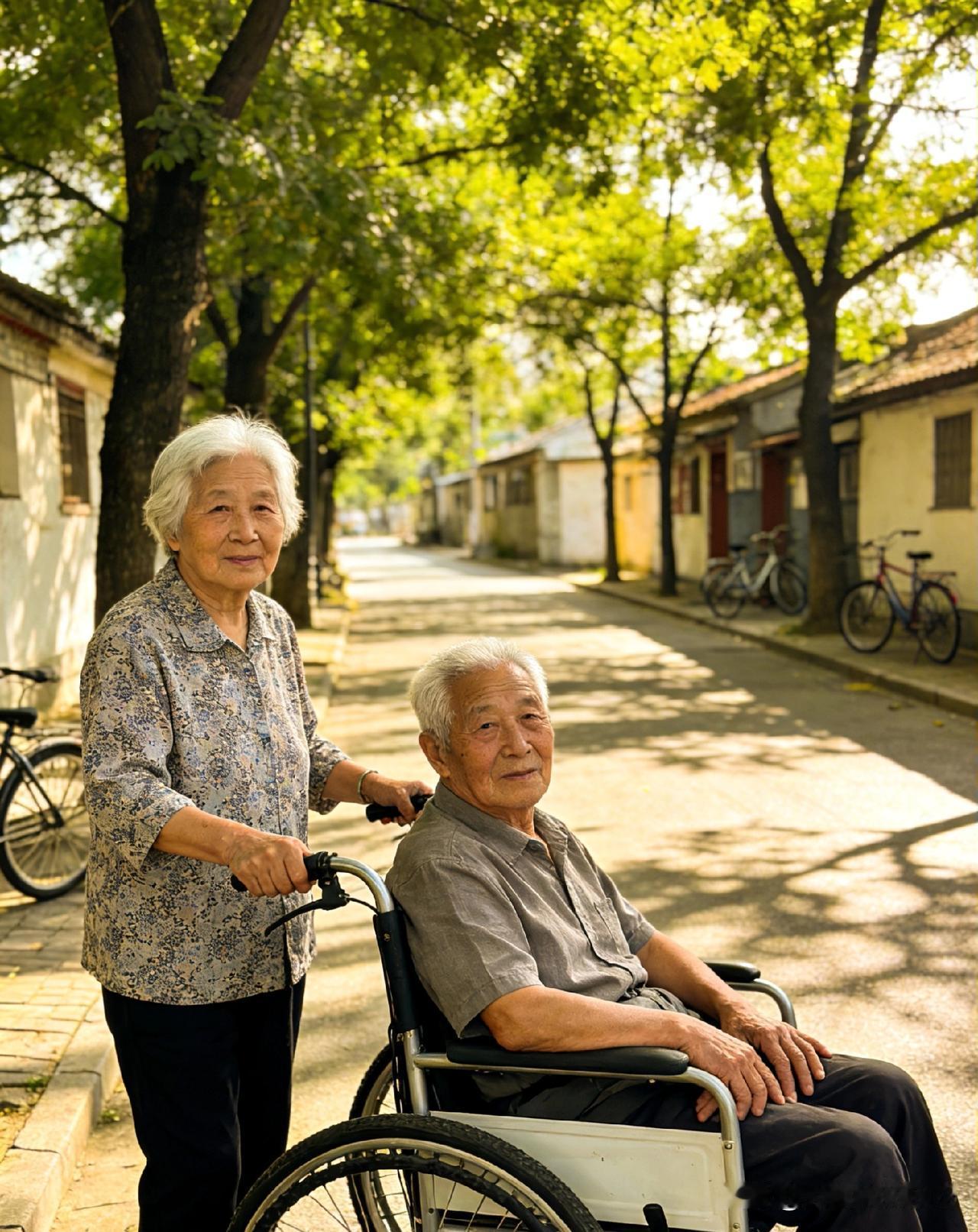 【这才是“真爱”的最高境界?】 公园里,一位满头银发的老奶奶推着轮椅上的老爷爷散