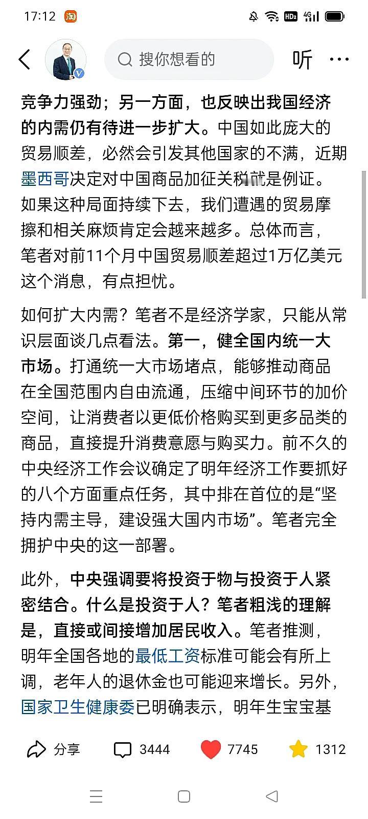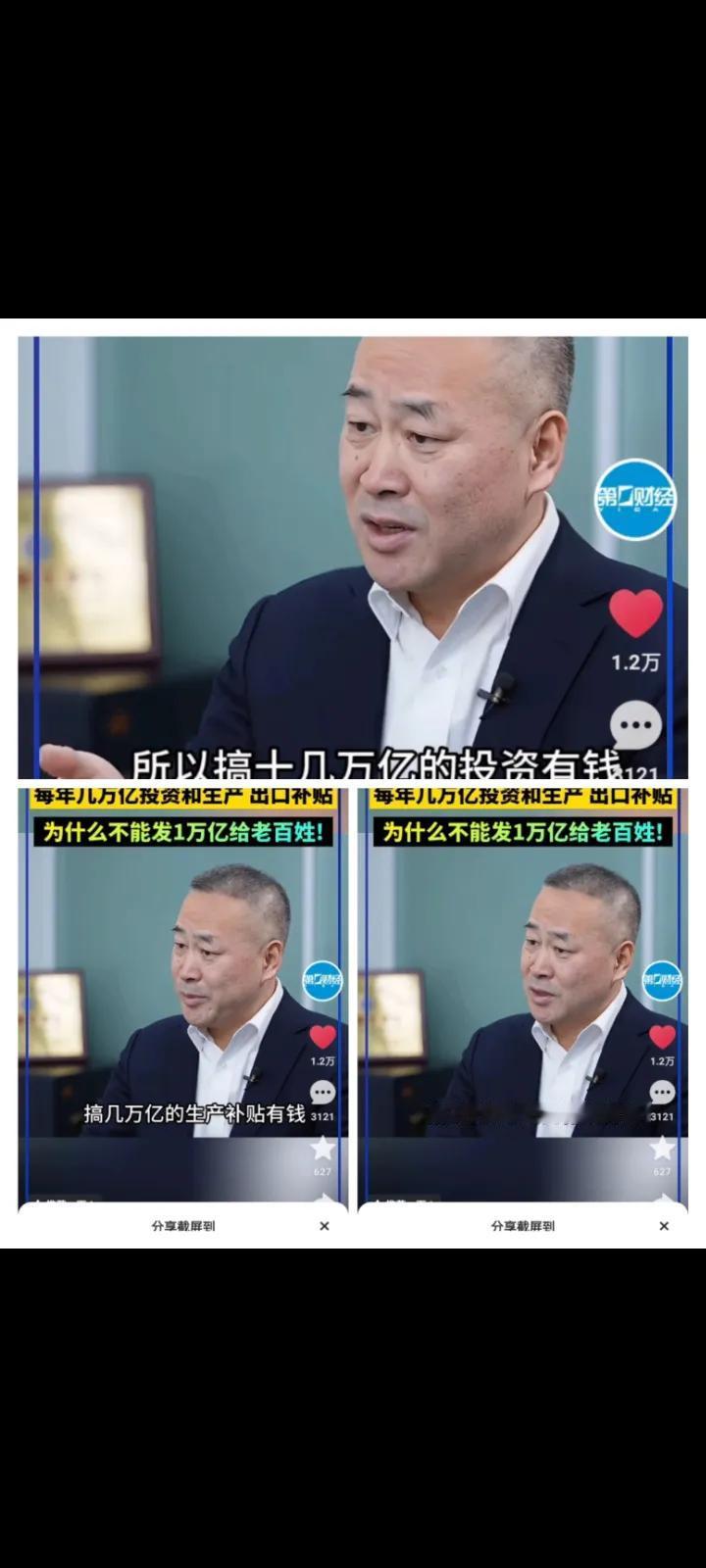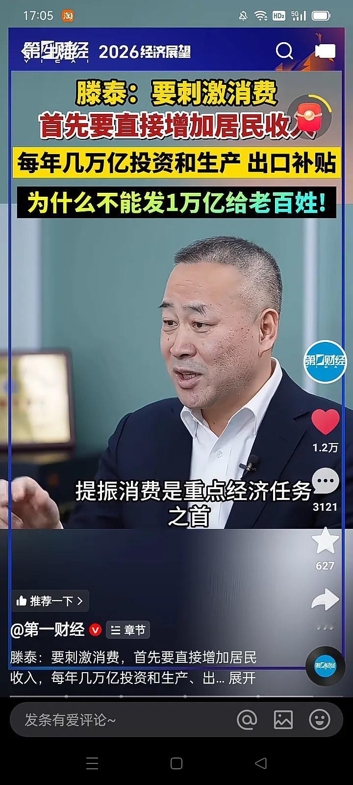 增加广大城乡居民收入,才能改善民生、扩大消费,才是促进经济健康稳定发展的法宝和初心! *中央经济工作会议明确要实施城乡居民增收计划,这也是提振消费、扩大内需的关键动力! *经济学家滕泰建议应该向老百姓发放一万亿真金白银的消费补贴! 他这样说:1发现金或者代金券都可以,但是不能限制消费对象。 2补贴要向6亿中低收入者倾斜。有钱人买汽车不在乎几千块补贴,但是普通人却更需要其他商品! 3国家每年搞十几万亿的经济建设投资,政府每年向企业补贴几万元,为什么就不能给广大的人民消费者直接补贴一万亿呢?! 4老百姓有钱了,不用刺激,他自然愿意消费。政府得掏出钱来鼓励老百姓消费。 *金灿荣教授也建议国家可以减少1.9万亿的出口退税,用这笔钱来增加农民养老金、养育新生儿和补助城乡困难群体! *我想:我们的确应该借鉴香港以及外国向老百姓发钱的做法,这样有利于促进社会公平稳定,有利于落实国家提倡的从‘投资于物’向‘投资于人’的兼顾和转变,有利于改善民生、促进消费,实现生产、分配、消费的良性互动和经济的健康稳定发展。 要知道我们发展生社会主义产力和经济的根本目的就是要改善民生、实现共同富裕!这也是我们党和政府的伟大初心和光荣使命。
