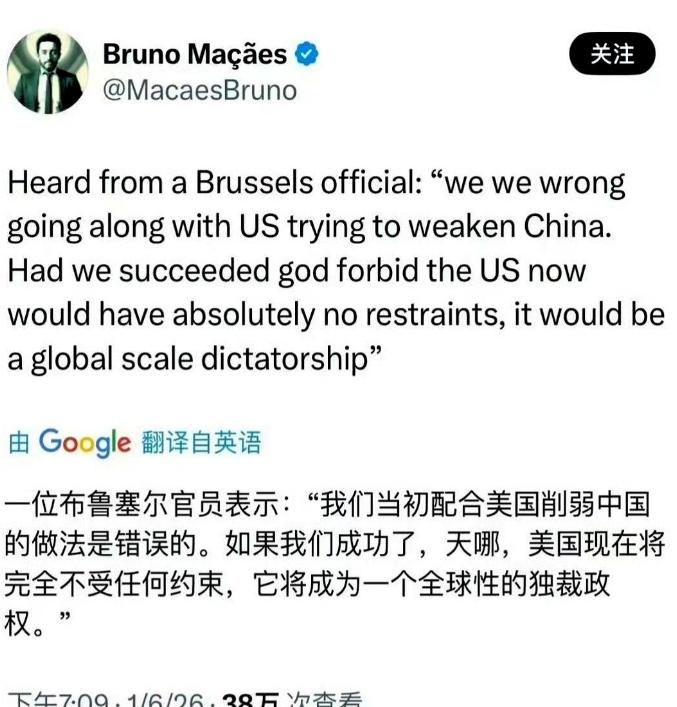 欧洲一位高官现在感到特别庆幸,幸亏当初没把中国“摁”下去,不然现在美国没有对手能“抗衡”,俨然成了个“全球独裁者”,这种日子显然对谁都不好过。 其实说白了,中国在崛起这条路上,欧美国家没少给咱们“使绊子”。 要不是因为咱们团结以及正确的政策,估计咱们很难发展到今天这一步。 而说实话,现在世界上能与美国抗衡的,估计就剩下我们了。 中美之间存在很多合作,同时在竞争的时候,双方也能打得有来有回。 再过几个月就是特朗普访华的日子,估计是怕闹出什么幺蛾子,所以最近美方对中方的态度格外缓和。 即便是“小弟”日本跑去找他帮忙“对付”中国,美国那边也只是暂时安抚好日本的情绪,而并没有对咱们真的下手。 可以这么说,中方是很希望和各个国家和平发展的,但若是有国家想越红线,那咱们也不会给他们留下讨价还价的余地。