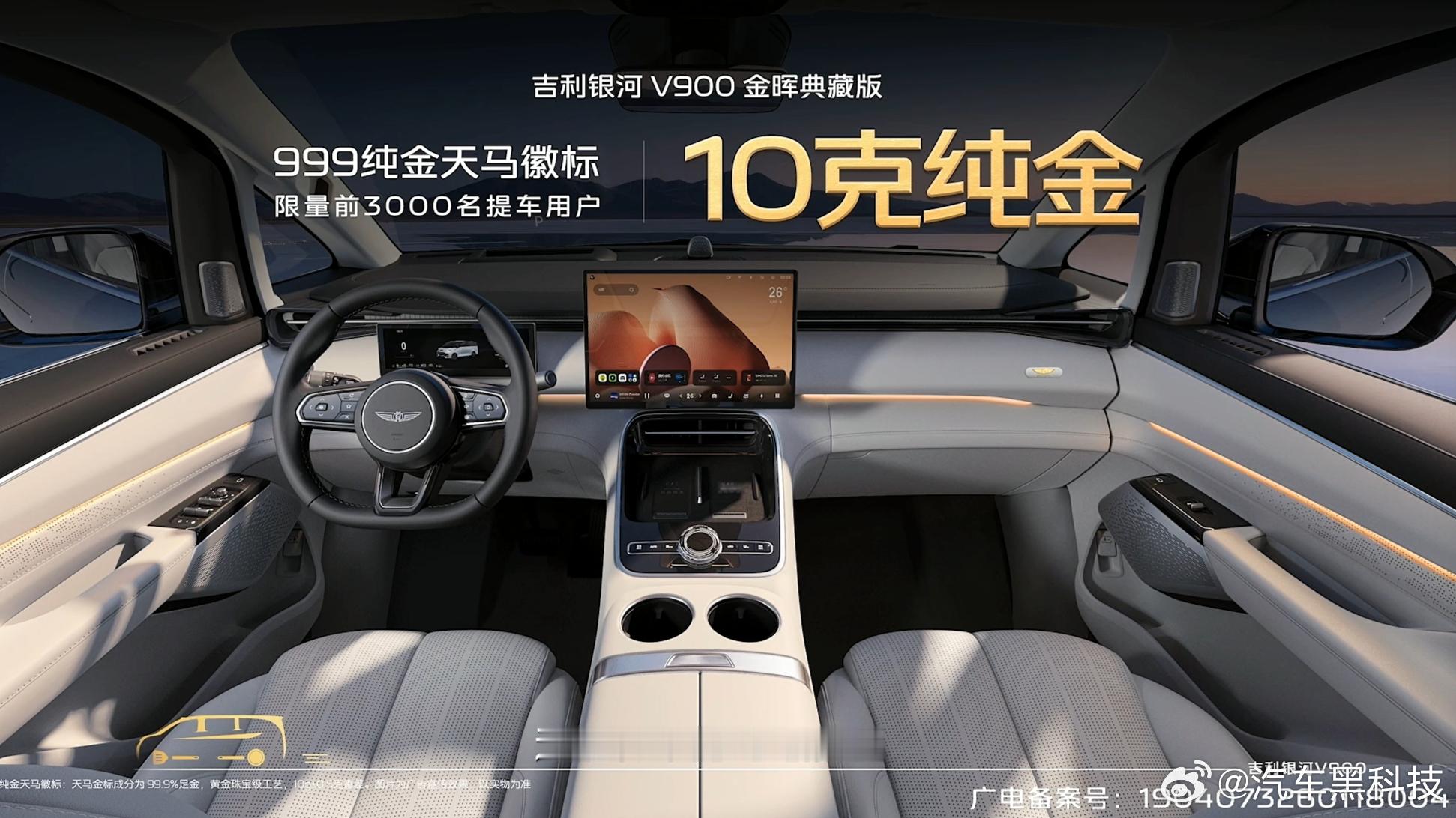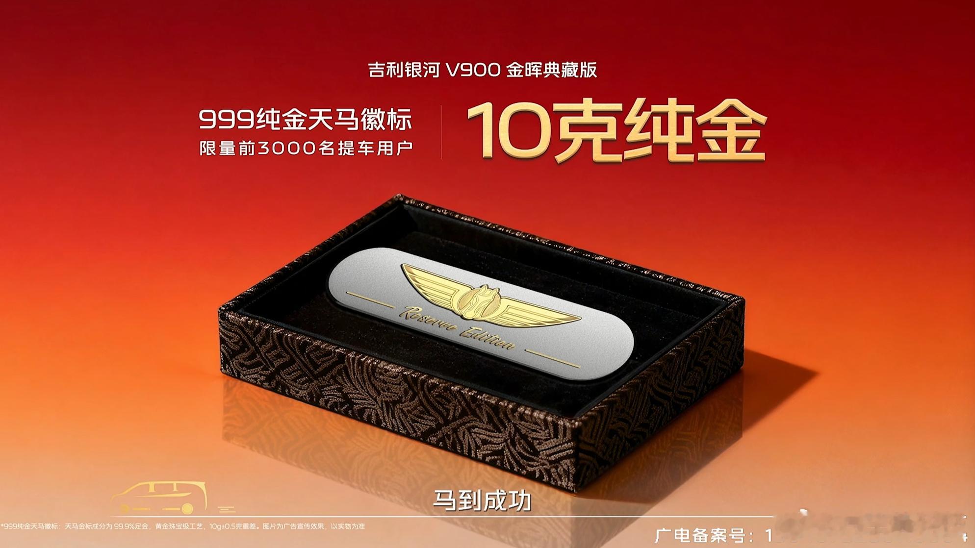 买吉利银河V900送10克纯金 1月20日,在吉利银河V900发布会上,吉利银河官宣吉利银河V900金晖典藏版前3000名提车车主,可获赠10克纯金车标,价值15000元。记得上次是买车送黄花梨树~ 吉利银河V900限时售26.98万起
