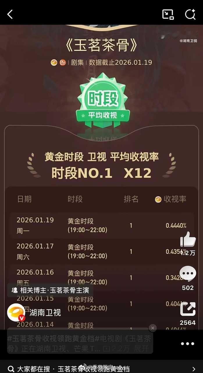 侯明昊又收获了一番实绩拿下12个卫视第一!收视领跑卫视黄金档玉茗茶骨湖南卫视播的好啊,开年红啊!上个剧大结局市占率从0.785%拉升到1.40%只能说一句牛! 玉茗茶骨收视领跑黄金档