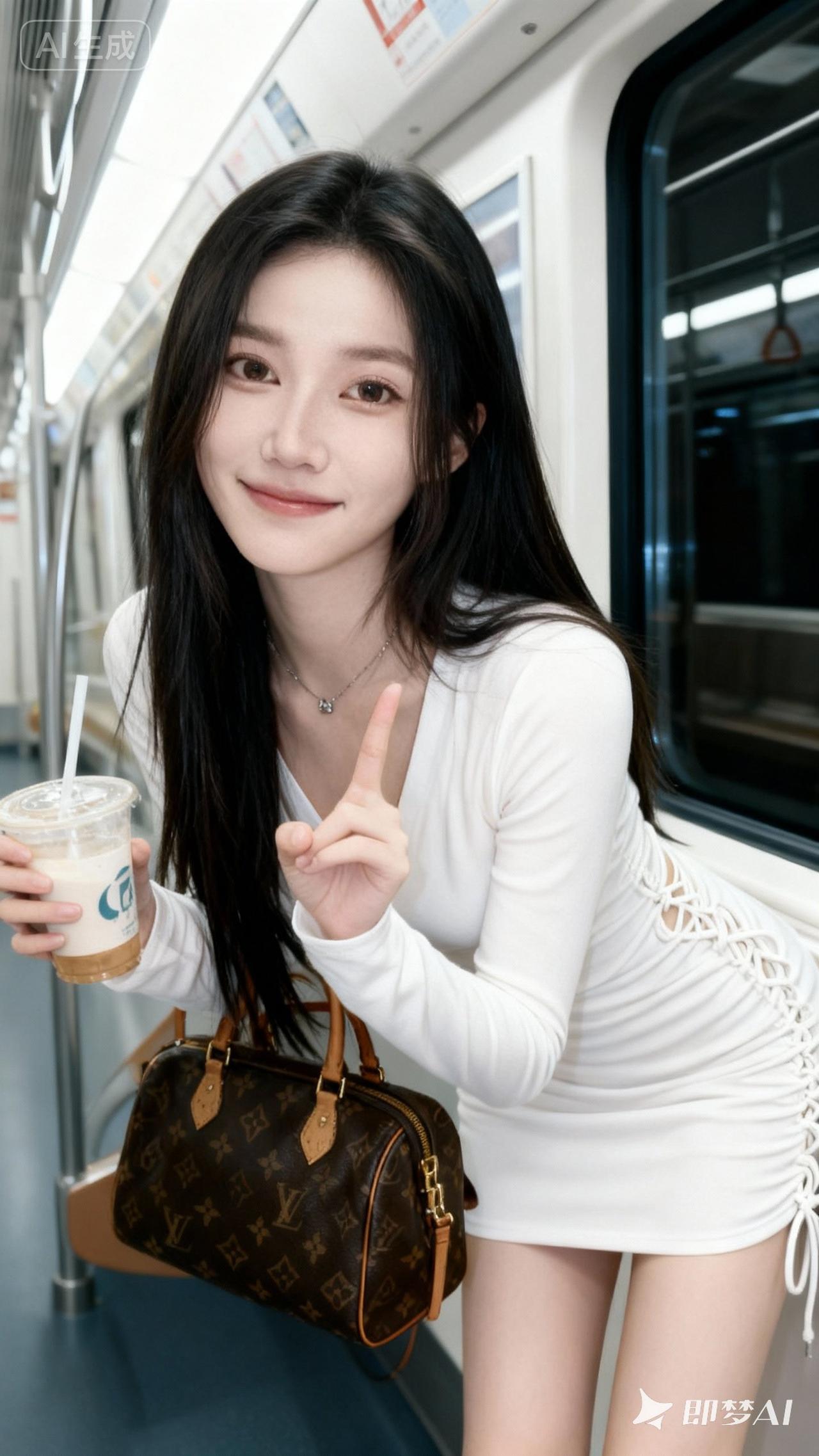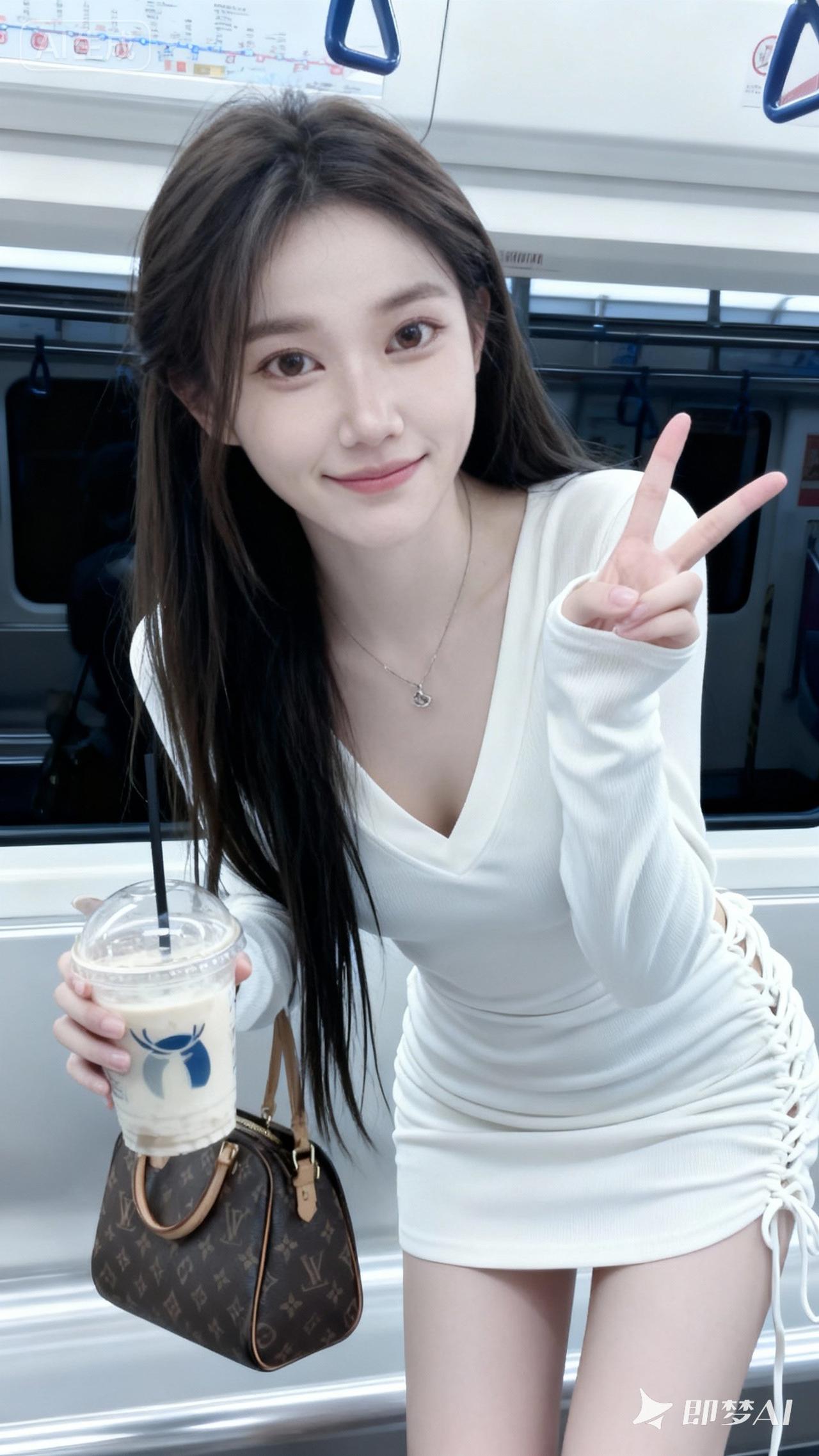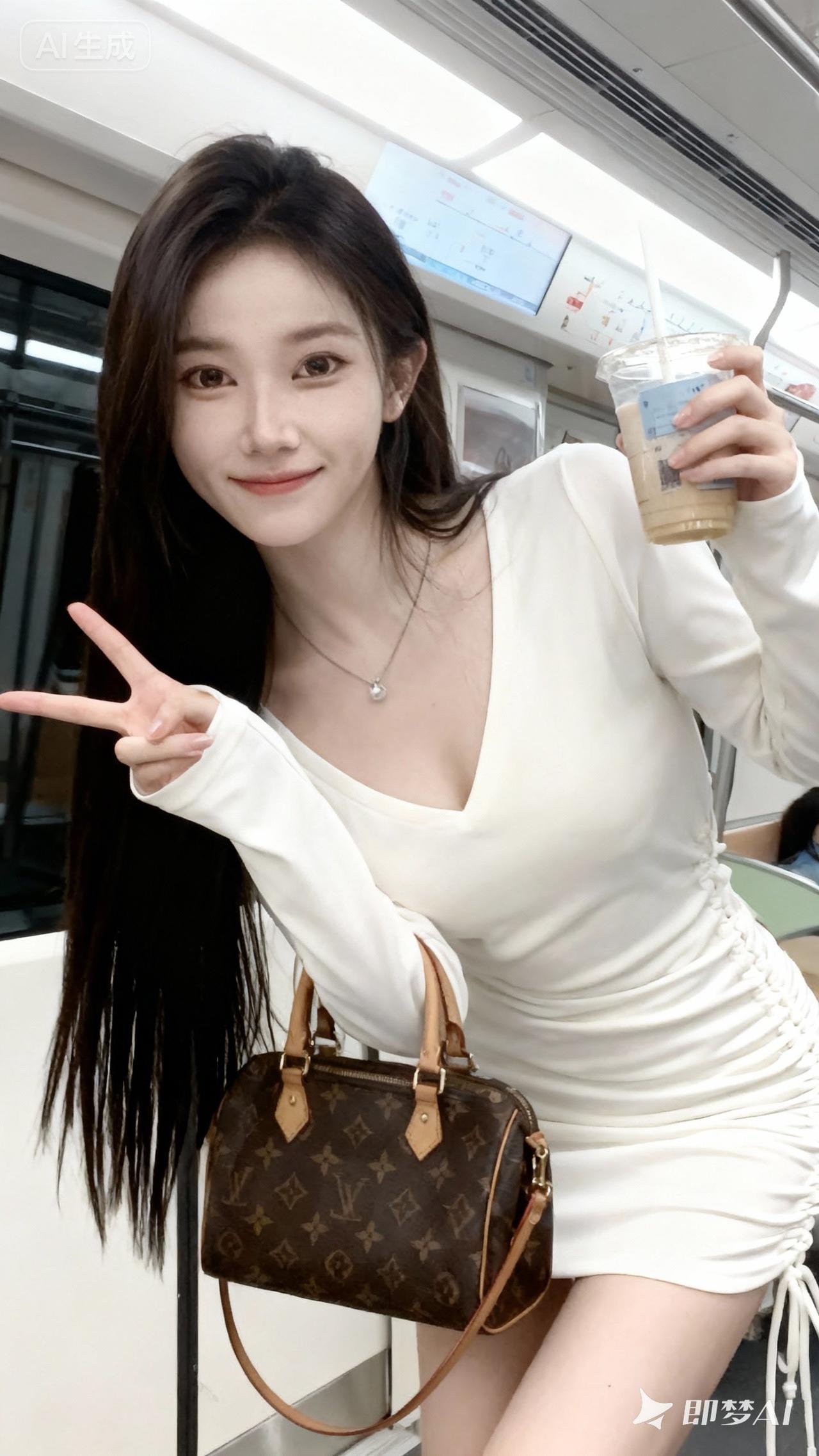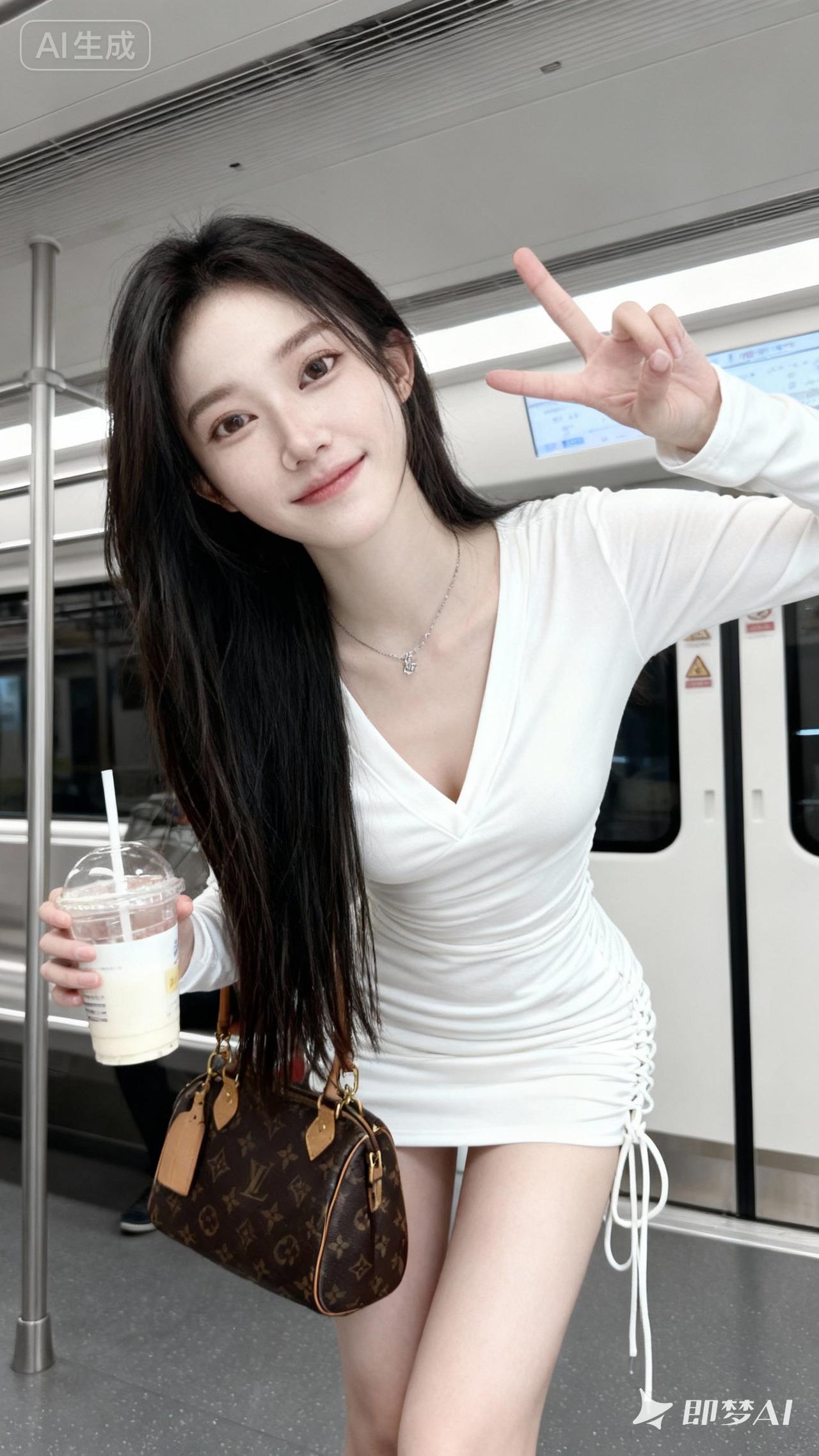 日常快照风格,非精心构图或打光,冷白皮,脸不变,穿着一件白色的长袖抽绳包臀连衣短裙