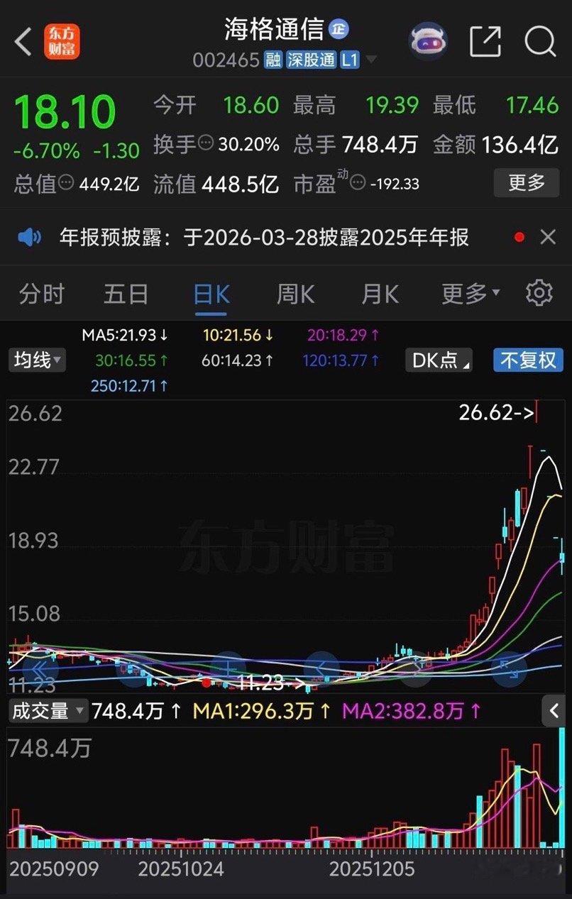 海格通信跌的太惨了,连续三个跌停板后早盘仍然惨烈低开4.12%,开盘稍微震荡不久就持续下跌,恐慌股民纷纷割肉出逃,午后一度砸向跌停板,不过由于是第四个跌停很多资金还是愿意进去抄底,股价很快就持续回升,拉升了两波差点翻红,但是今天大盘也在调整,割肉盘不断杀出海格通信最终冲高回落,收盘暴跌6.7%,市值仅449亿一天的成交额高达136亿,换手率高达30.2%,相当惨烈,追高股民惨不忍睹。