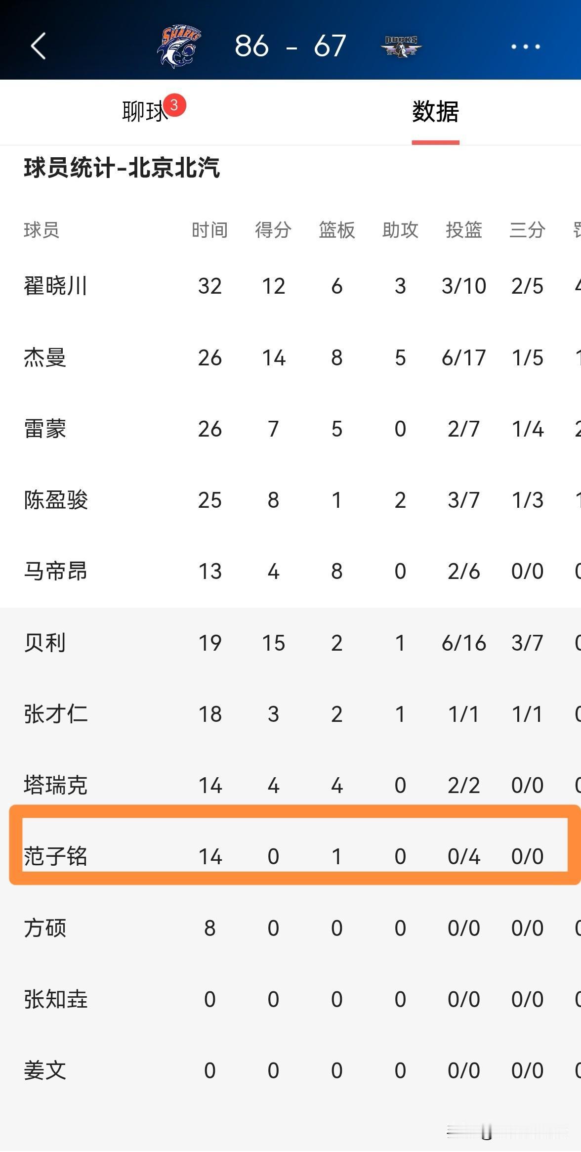 北京北汽大将范子铭真是给机会不中用啊!在今天北京北汽客场以67:86输给上海久事的比赛中,范子铭完全没有抓住球队当家中锋周琦因伤缺阵的好机会,全场比赛下来,范子铭替补出战14分钟,投篮4中0怒砍0分,还有1次失误和3次犯规,他的场上正负值为-9。 事实证明,当北京北汽对阵实力强大的球队时,范子铭更是难堪大用,因为范子铭在场上更加迷糊。