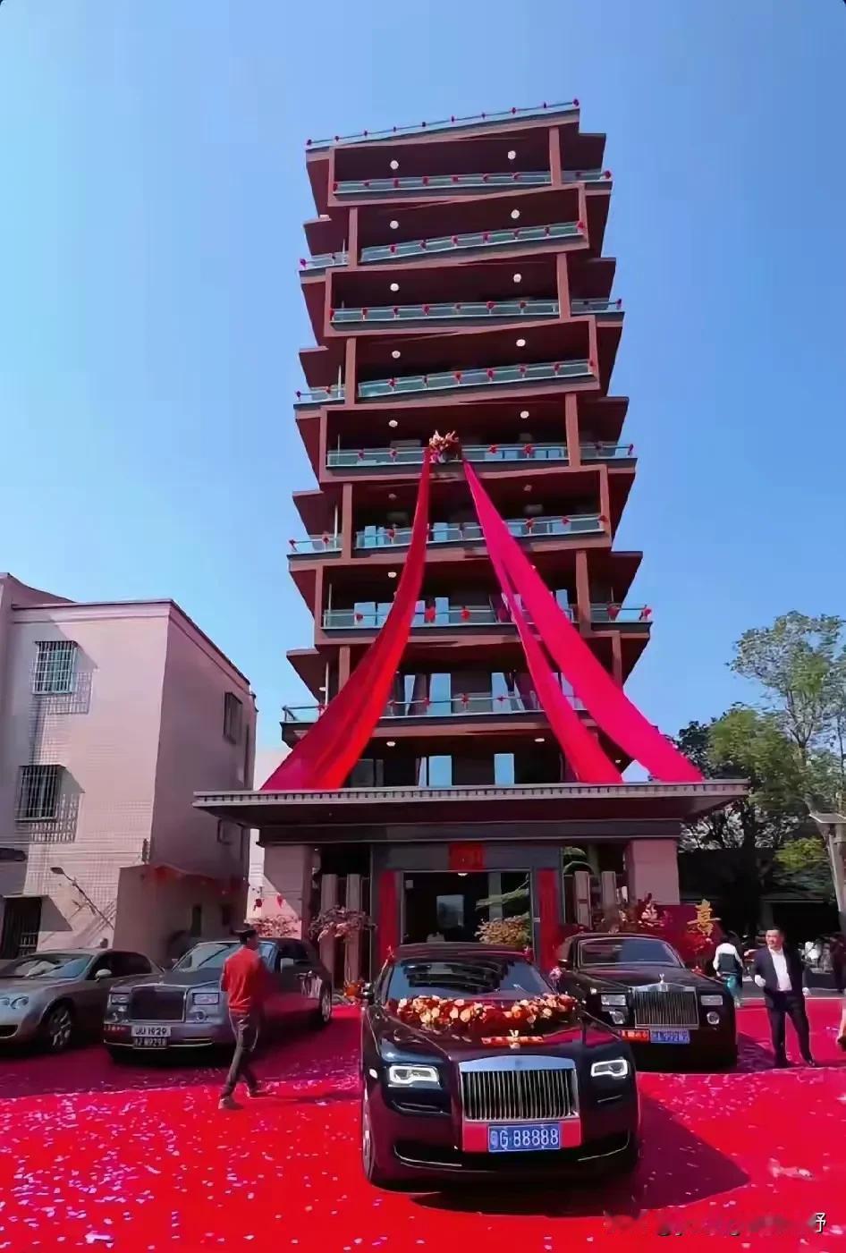 湛江吴川的土豪可能在国内都是排在前位的。最近吴川又有位土豪,在老家又搞出了一次超豪华的婚礼。不仅请来了多辆豪车助阵,包括村里的这座前卫的楼房,在国内也是独树一帜。而且从这外观来看也能看出造价绝对不菲。