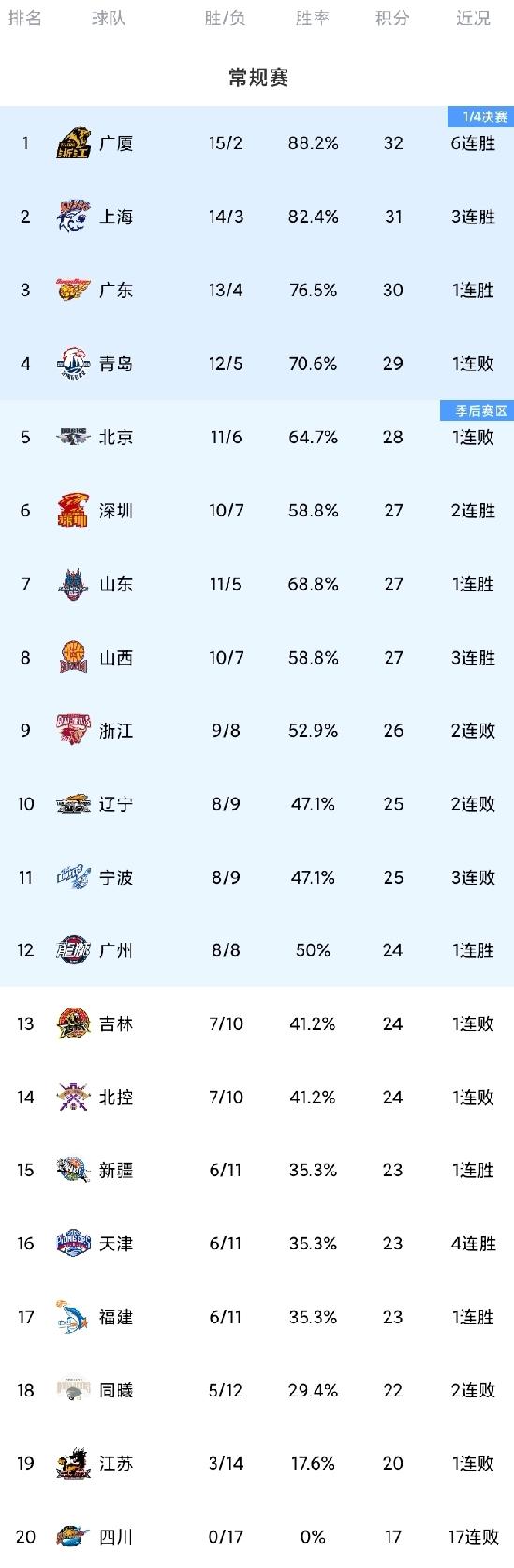 CBA最新积分榜!北京近8战5负,上海重回第2,辽宁胜率跌破五成。 卡位战,赛前