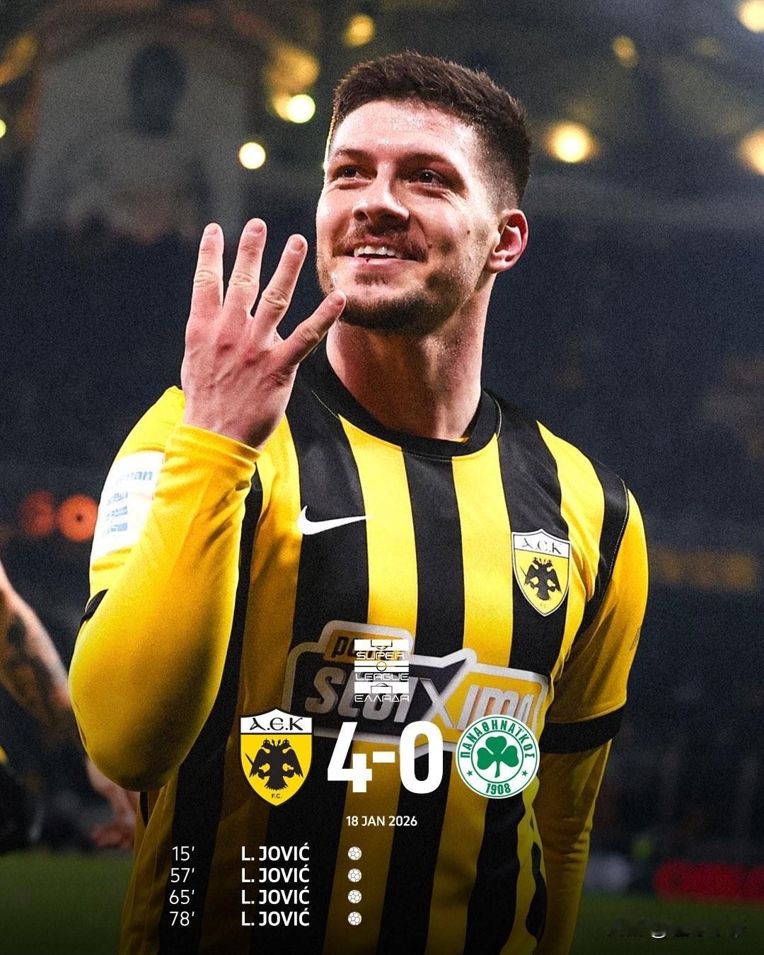 皇马终于释怀了,队史最大的水货约维奇在希腊联赛上演大四喜! 在本轮希腊超级联赛雅典德比大战中,原皇马旧将约维奇为雅典AEK首发出战84分钟,势不可挡打进四球上演了大四喜,带领雅典AEK4-0大胜帕纳辛奈科斯。 本赛季约维奇代表雅典AEK出战了27场比赛,打进15球还送出1次助攻,目前在希腊联赛射手榜上排名第2,距离榜首只差一球,很有希望拿到金靴了。 皇马在2019年以6300万欧元从法兰克福引进了21岁的约维奇,没想到在法兰克福大杀四方的约维奇来到了皇马却水土不服,为皇马出战了51场比赛只贡献了3球5助攻的数据,成为了皇马队史最大的水货之一,最终在2022年夏窗自由身离队,让皇马赔了夫人又折兵。 现在约维奇在希腊联赛终于又找回了当初的状态,皇马也终于释怀了,看来当初不是自己眼光不行,而是约维奇不适应西甲而已。