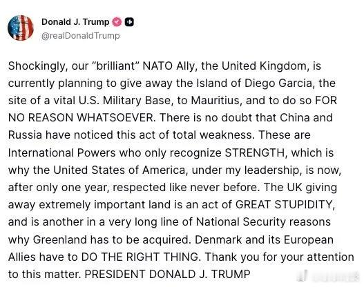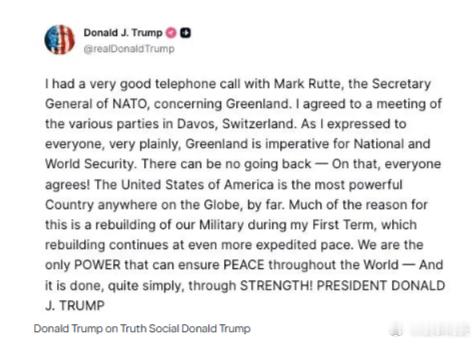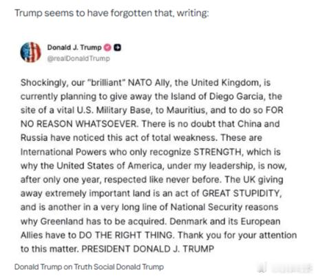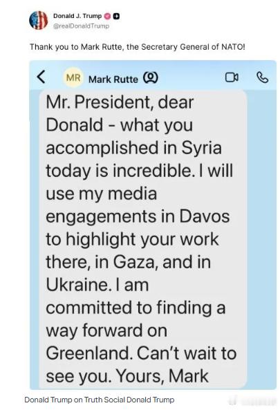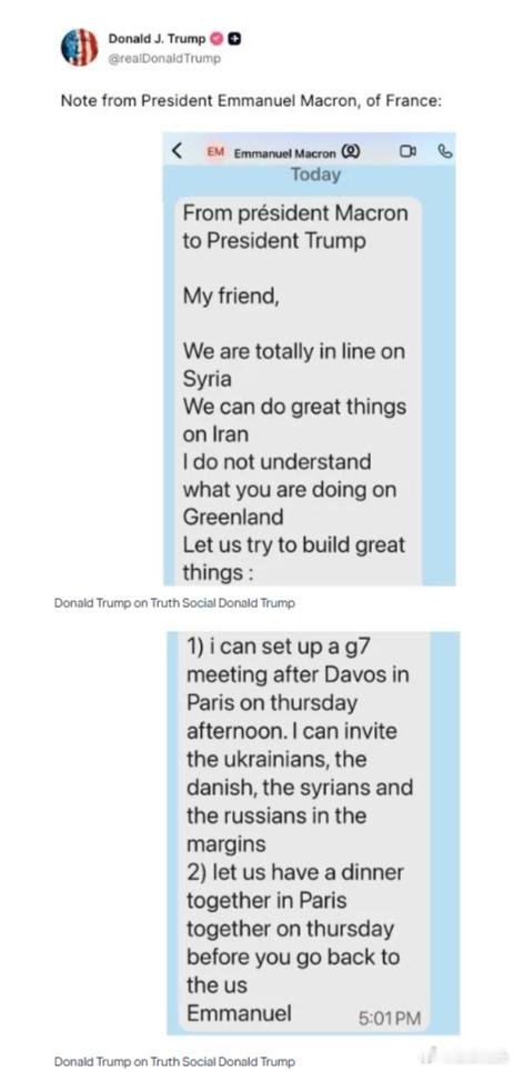 【特朗普在深夜疯狂发布有关格陵兰岛的帖子】[做梦都想格陵兰啊](Huffpost)周二凌晨,美国总统唐纳德·特朗普在其社交平台Truth Social上发布了大量帖文,内容包括对美国盟友的辱骂,以及疑似世界各国领导人私下对话的截图。尽管其帖文涉及从明尼苏达州移民海关执法局突袭行动到美联储理事丽莎·库克(特朗普正试图将其解职)等诸多话题,但多数内容聚焦于格陵兰岛——这个丹麦半自治地区正面临特朗普以武力夺取的威胁。特朗普于美国东部时间凌晨12点26分至1点53分发布的消息中,包含数张展示格陵兰岛归其掌控的网络梗图(图1)。在另一条推文中,特朗普指责英国计划将查戈斯群岛移交毛里求斯是"极度愚蠢"和"彻底软弱"之举,并以此作为美国需要掌控格陵兰岛的证据。然而就在去年,国务卿马可·卢比奥曾表示特朗普支持该计划。卢比奥称特朗普认为移交是"一项重大成就"。特朗普似乎已忘记此事,他在推文中写道(图2)。在另一篇帖子中,他分享了一条看似来自法国总统埃马纽埃尔·马克龙的短信(图3)。马克龙在短信中试图安排本周在瑞士达沃斯举行的世界经济论坛会晤,但特朗普试图吞并格陵兰岛的举动令他感到困惑,尽管整体语气仍显友好。特朗普表示,他还就格陵兰问题与北约秘书长马克·吕特进行了“一次非常好的电话交谈”。他在推文(图)中写道:“正如我向所有人明确表达的那样,格陵兰对国家安全和世界安全至关重要。此事不容退让——对此,所有人都认同!”