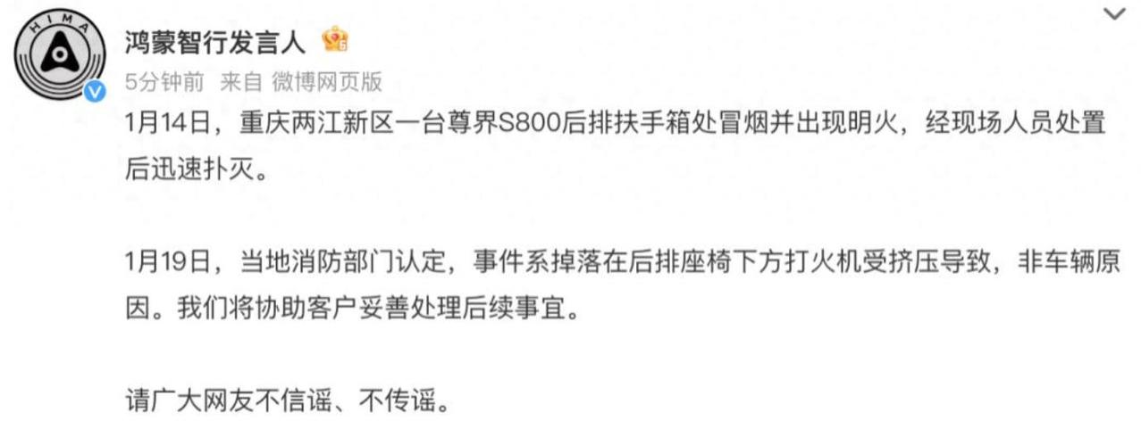 【尊界S800被曝起火?官方回应!】日前,针对此前网传尊界S800后排扶手箱处冒烟起火一事,鸿蒙智行进行了回应,其表示,地消防部门认定,起火原因为后排座椅下方的打火机受挤压爆燃,排除车辆自身问题。鸿蒙智行表示将协助客户处理后续事宜,并呼吁公众不信谣、不传谣。 据了解,尊界S800是江淮和华为合作推出的对标奔驰迈巴赫的顶级座驾,虽然售价高达百万,但是销量表现并不差,其2025年12月国内零售量达到了4223辆,如此成绩在同价位车型中堪称出彩。