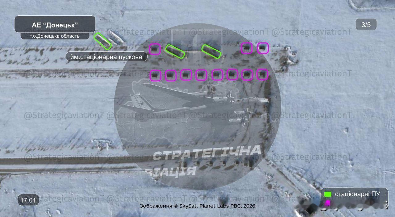 🇷🇺俄罗斯正在顿涅茨克机​​场扩建其无人机发射基础设施。 乌方持续全天候监控俄军设施的运作。乌克兰方面公布了1月17日顿涅茨克国际机场的卫星图像,证实了俄罗斯正在扩建用于发射“格朗-2”攻击型无人机的基础设施。 乌方还强调,过去一个月内,该机场新增了三个固定发射台,使发射台总数达到七个。这表明俄方正在系统性地提高无人机的使用强度,并力求确保从前线地区持续发射无人机。 用于存放无人机的开放式机库数量保持不变,仍为93个: 81个机库可容纳两架无人机, 12个机库可容纳一架无人机。 因此,总存储容量为174架无人机,这还不包括机场内其他大型存储设施。这样的后勤保障能力使其能够积累大量储备,以应对大规模的批量发射。 新的威胁:格朗战机。尤其值得注意的是,其中一个新建的发射台已改装用于发射“格朗-4”和“格朗-5”喷气式无人机。这些无人机已被用于打击克里维里赫州和第聂伯罗彼得罗夫斯克州的目标,这证实了乌克兰防空力量使用的装备范围不断扩大,以及其面临的任务日益复杂。