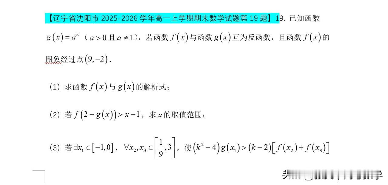 受天气因素影响,辽宁省沈阳市及东北地区多所高中高一年级上学期期末考试已陆续结束。从本次考试数学试题分析(如沈阳市期末第19题、东北育才学校期末第18题),可以看出反函数及其综合应用这一考点在近年相对弱化后重新被激活,并成为压轴题的重要考查方向。两道试题均以指数函数、对数函数为载体,深入考查了反函数的求法、反函数图像性质、以及基于反函数的不等式恒成立与存在性问题,对学生的代数变形、数形结合能力提出了较高要求。 在此提醒广大高一学生及备考考生:务必重视反函数相关知识的系统复习,包括反函数的定义、求解步骤、图像对称性,以及其与指数、对数函数结合的常见题型。这一考点的“回归”可能预示着未来考试中函数部分的命题趋势,建议结合真题进行针对性训练,以提升解决综合问题的能力。