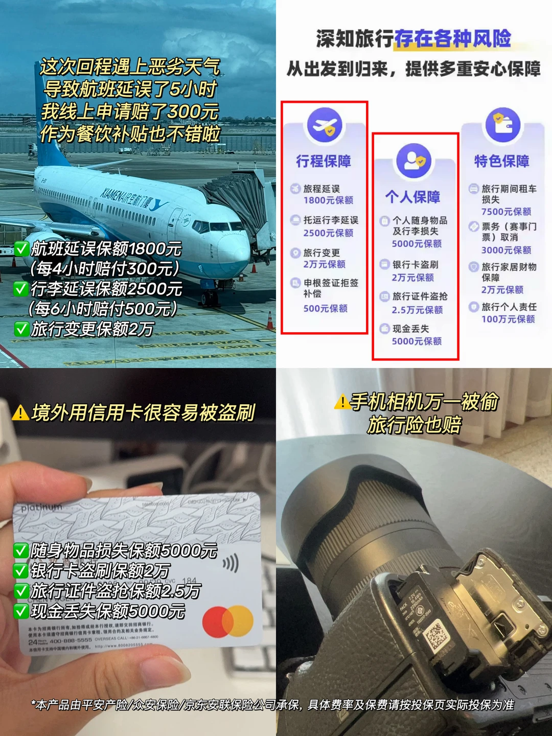 这次回程选了廉航,延误很常见,再加上遇上恶劣天气,导致航班延误了5h+...在机场干等真的气死了!后面我在线上申请赔了300元,降低一些损失,当作滞留机场的餐饮补贴了!⚠️Tips:航班延误保额1800元(每4小时赔付300元),行李延误保额2500元(每6小时赔付500元),旅行变更保额2万
