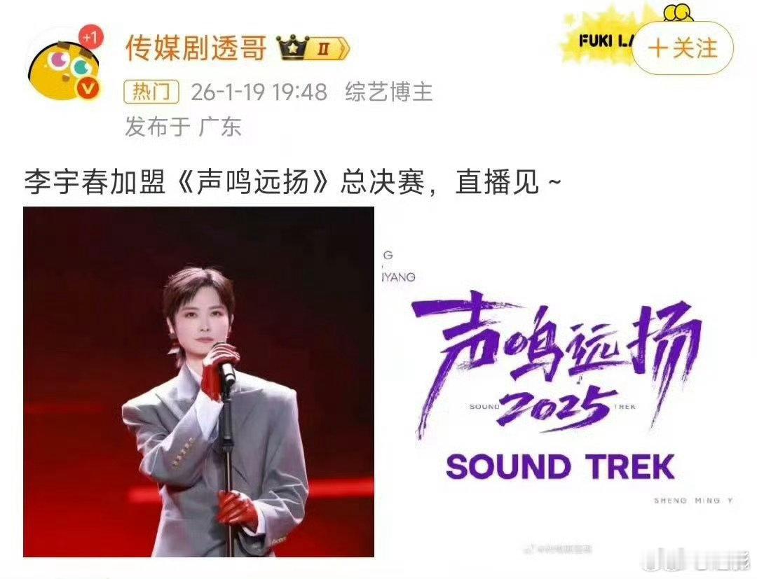 李宇春李宇春加盟声鸣远扬总决赛网传李宇春加盟声鸣远扬2025总决赛李宇春的舞台魅力遇上三赛道选手,《声鸣远扬2025》决赛夜封神!