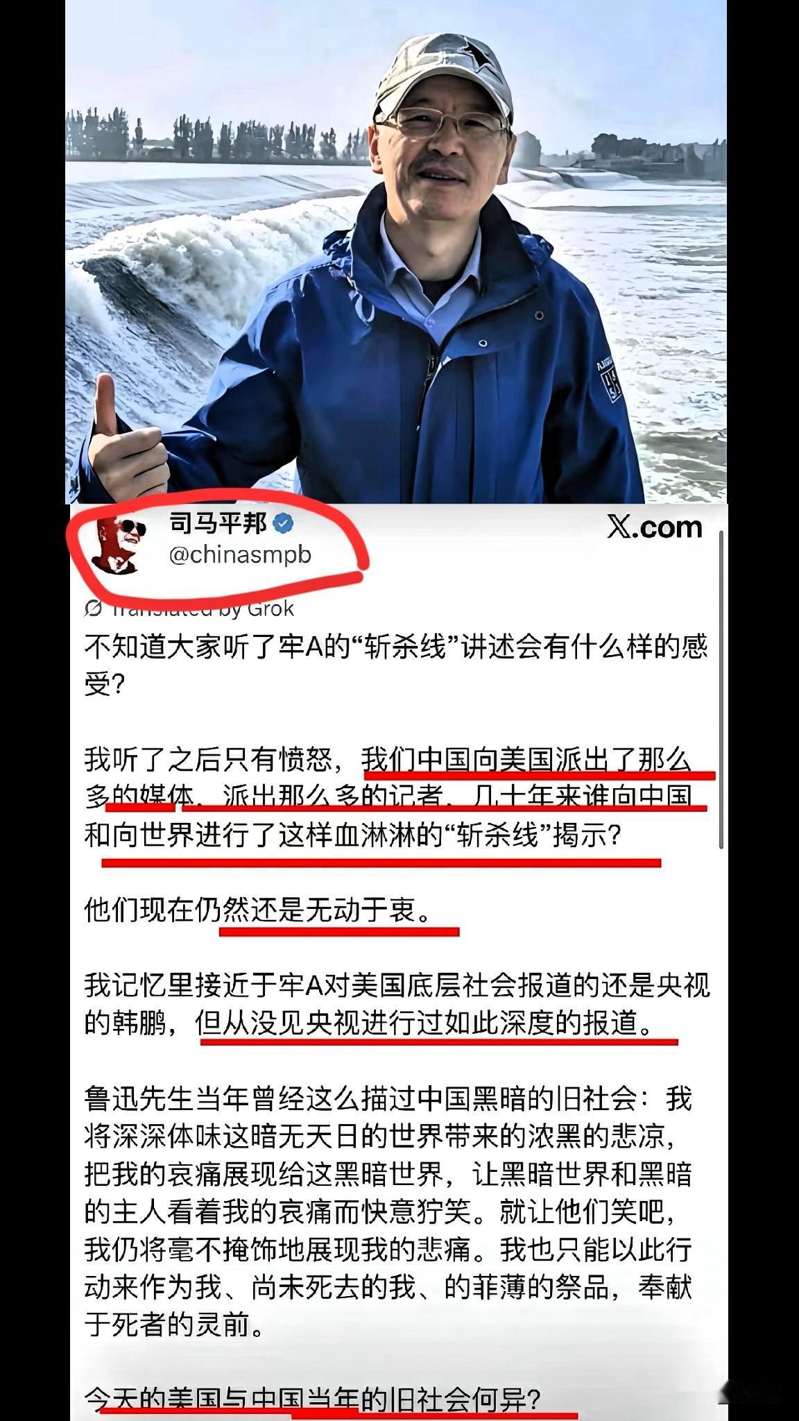 司马平邦胆子也太大了 简直是“敢说界”的扛把子! 想想看,咱们往老美那儿派了多少 大记者,享受着高薪厚禄,住着五星级大饭店,几十年下来,老美那层“画皮”愣是没被扒下来多少。 前些年,为了跟老美搞好关系,连抗美援朝这种彰显国威的事儿都不敢大肆宣传,网上说句美国不好,都能被喷成筛子。 可如今呢,世道大变样!那些所谓的高端媒体,一个个跟聋了似的,对真相视而不见。倒是咱们平时瞧不上的自媒体,拿着手机就能把真相给抖搂出来,让人直呼过瘾。 原来不是咱们看不见真相,是有人故意捂着咱们的眼睛。这几十年的“学费”,算是交得明明白白,脸被打得生疼!