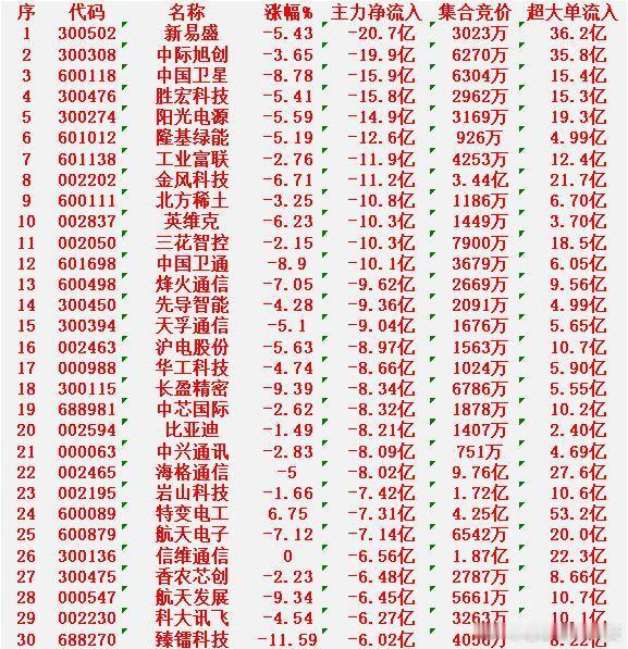 1月20日尾盘,主力资金大幅卖出的30名单!新易盛:净流出20.7亿元,超大单流入36.2亿元中际旭创:净流出19.9亿元,超大单流入35.8亿元中国卫星:净流出15.9亿元,超大单流入15.4亿元胜宏科技:净流出15.8亿元,超大单流入15.3亿元阳光电源:净流出14.9亿元,超大单流入19.3亿元