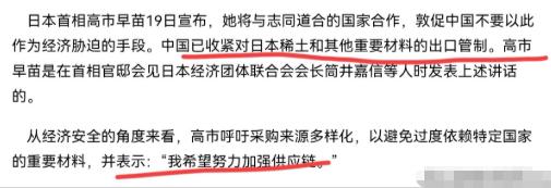 不会因为中国的压力而让步,高市早苗出来表态了!1月19日,日本首相高市早苗宣布,她将与志同道合的国家合作,敦促中国不要以此作为“经济胁迫”的手段。高市早苗称,中国已收紧对日本稀土和其他重要材料的出口管制。日本将会让采购来源多样化,以避免过度依赖特定国家的重要材料,我希望努力加强供应链。 高市早苗这话说得倒是掷地有声,一副硬刚到底的架势,仿佛只要态度够坚决,就能无视所有现实难题似的。 张口就给中国扣上“经济胁迫”的帽子,连半点正视问题根源的意思都没有,说白了就是揣着明白装糊涂,非要一条道走到黑跟咱们硬扛。 她大概是觉得,只要喊出“供应链多元化”的口号,再拉上几个所谓的“志同道合”国家,就能顺理成章摆脱对中国的依赖,可这事儿哪有那么简单。 所谓的“志同道合的国家”,说穿了就是美国、印度这些盟友圈子里的伙伴。日本现在一门心思要跟这些国家抱团,想靠着拉群组队的方式重构供应链,把中国踢出局。 可稀土这类关键材料的供应链,不是说重构就能重构的。全球九成以上的稀土加工环节都攥在中国手里,不管是提炼技术还是产业链配套,都是经过几十年沉淀才形成的优势,不是随便找个国家合作就能短期内补上的窟窿。 日本就算能从澳大利亚、美国弄到点稀土矿,最后还得找地方加工成能用的材料,绕来绕去,短期内根本离不开中国的产业链支撑。 更有意思的是,日本一边喊着要摆脱依赖,一边又没法真正切断和中国的合作。 毕竟不管是高科技产业的芯片制造,还是汽车产业的电机生产,乃至国防领域的装备制造,都离不开稀土和各类关键材料,而这些材料的稳定供应,长期以来都依赖中国。 现在中国收紧出口管制,日本不反思自己供应链布局过于单一的问题,反而倒打一耙指责中国“胁迫”,这波操作纯属转移矛盾,给自己的被动处境找借口。 高市早苗嘴上说要“加强供应链”,可实际能拿出来的办法,除了拉盟友凑数,就没什么实质性动作。 之前日本跟美国签了不少稀土合作协议,想着靠美国的矿场和日本的技术搞联合生产,可美国本土的稀土加工产业本身就不成熟,连自己的需求都没法完全满足,哪有多余的能力支撑日本? 跟印度的合作更是画饼大于实效,印度的稀土产能和加工技术摆在那儿,短期内根本顶不上来,最后大概率就是协议签了一堆,实际能落地的没多少。 日本现在就是死撑着不肯让步,明明知道自己的产业命脉在关键材料上被牵制,却非要硬撑着摆姿态。 大概是觉得一旦松口,就丢了所谓的“颜面”,也没法向国内的产业界和民众交代。可硬扛的代价,最终还是要日本自己的企业来承担。 供应链多元化不是喊口号就能实现的,需要时间、资金和技术的持续投入,短则几年长则十几年,在这期间,日本的相关产业只能在被动中硬熬。 其实明眼人都能看出来,日本所谓的“不让步”,更多是一种政治表态,而非实际可行的策略。 高市早苗这么说,一方面是给国内打气,稳定人心;另一方面也是做给盟友看,彰显自己跟西方阵营的一致性。 可现实不会因为几句硬气话就改变,中国在关键材料供应链上的优势,不是靠短期合作就能替代的,这是市场规律和产业积累的结果,不是所谓的“经济胁迫”。 日本要是真的想解决问题,与其硬扛和指责,不如正视根本矛盾,坐下来跟中国理性沟通。毕竟供应链安全是相互的,中国收紧出口管制,也是基于自身的产业安全和战略考量,并非有意针对日本。 可日本偏偏选了最拧巴的一条路,非要用对抗的姿态来应对,最后只会让自己的处境更被动。 说白了,日本现在就是打肿脸充胖子,硬撑着不肯承认自己的依赖和被动。高市早苗的表态,更像是一场自欺欺人的政治秀,看着硬气十足,实则底气不足。 等到国内产业因为材料供应问题陆续出现困境,日本大概才会明白,硬扛解决不了任何问题,正视现实、理性沟通,才是唯一的出路。 现在这种死撑的架势,除了徒增尴尬,没什么实际意义,最后吃亏的还是自己。