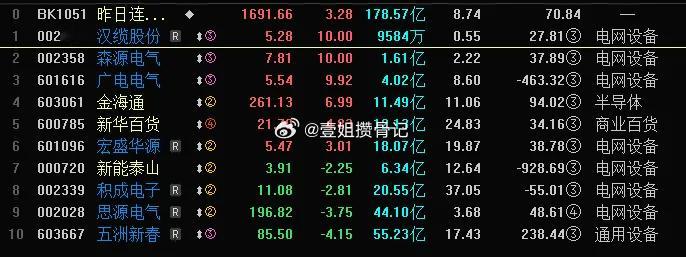 今天A股空间板骤降至3板,3板是A股空间板压缩至的最极限,高标打板情绪冰点,明天修复预期。今天空间3板3家,汉缆股份,森源电气,光电电气均是电网设备概念股。2个一字,一个换手板,明天争夺空间板。值得注意的是昨天的10家连板股,7家是电网设备概念股。这波降温,主要是针对主线商业航天,AI应用,这两条主线被干废,高标股多数A杀走势,连续跌停,强烈的亏米效应。连板股是游资的主要方向,现在游资,龙虎榜偃旗息鼓,高标接力情绪骤降,短线注意这个方向风险。题材爆炒,打板是近期的JG重点。