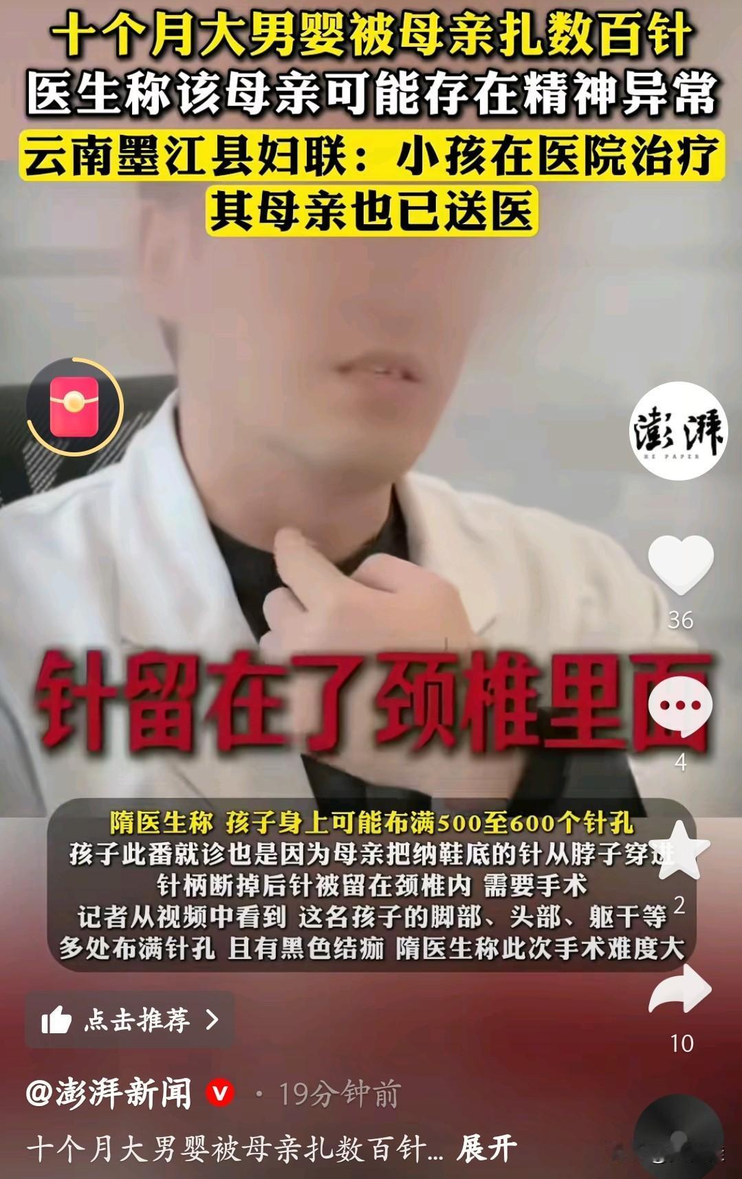 十个月大的男婴,浑身布满了五六百个针孔,连颈椎里都断了一根纳鞋底的针。这不是什么意外,竟是他亲生母亲下的手。 只要孩子不听话,或是发烧感冒,这位母亲就用针去扎孩子“放血”,直到针断在脖子里才送医。看着孩子身上密密麻麻的针孔和黑色结痂,真让人头皮发麻,心都跟着揪紧。 十个月大的娃,连话都不会说,疼了只能用哭声求救,可他最该依赖的妈妈,却成了伤害他的人。 都说母爱是本能,可这桩事让人又气又心疼。只盼孩子能早日康复,也希望有更多人关注产后和育儿期的心理问题,别再让无辜的孩子承受这样的伤害。