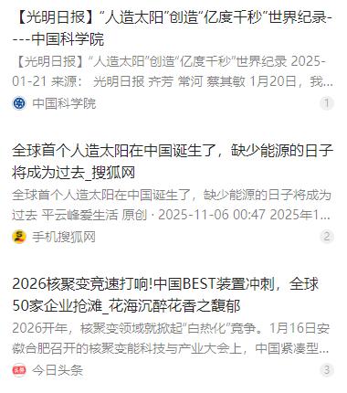 中国“人造太阳”一旦点亮,美国11艘航母舰队,将在24小时内,被激光武器“烧成废铁”?别再谈什么航母、导弹了,谁第一个掌握可控核聚变,谁就掌握了“无限能源”。 麻烦看官老爷们右上角点击一下“关注”,既方便您进行讨论和分享,又能给您带来不一样的参与感,感谢您的支持! 2026 开年,中国在可控核聚变领域的捷报让全球瞩目。中科院团队与商业力量联手发力,不仅让等离子体密度实现显著提升,更在稳态运行时间上取得关键突破,为这项 “终极能源” 技术的落地按下了加速键。 很多人可能不懂核聚变的门道,但只要知道一点就行:它模拟太阳的能量产生方式,燃料取自海水里的氘,1 升海水的聚变能量就相当于 300 升汽油,几乎是取之不竭的能源宝库。 这次 2026 年初的突破,针对性解决了长期困扰行业的难题。之前等离子体密度不够、温度波动大,让核聚变始终停留在实验室阶段,而现在这些核心卡点被逐个攻破,为商业化落地铺好了关键一步。 中国的聚变探索早已形成体系化布局。既有中科院 EAST “东方超环” 这样的国之重器持续刷新世界纪录,也有 BEST 紧凑型装置加速建设,还有星环聚能、新奥集团等民企在不同技术路线上攻坚,“国家队 + 民企” 的协同模式让进展不断提速。 从军事应用的理论层面来看,可控核聚变的突破确实意义深远。传统武器装备的瓶颈大多卡在能源供给上,而无限能源的到来,可能让高能激光武器等装备摆脱储能枷锁,实现持续稳定运行。 美国的 11 艘航母战斗群一直是其海上霸权的核心,但这些传统军事体系依赖的是常规能源逻辑。一旦聚变能源驱动的激光防御网或新型攻击装备成型,传统航母的优势必然会大幅削弱,战争规则可能被重新定义。 就拿激光武器来说,现在的装备受限于储能,持续作战能力不足,而聚变能源能提供兆瓦级持续电力,不仅能让激光功率突破 1.5 兆瓦,拦截距离从 10 公里延伸到 20 公里以上,单次拦截成本还低至 1 美元。 航母的电磁弹射也是同理,当前美国福特号航母因功率不足,弹射几十次就容易出故障,而聚变能源配合成熟的储能技术,能让弹射功率提升 3 倍,间隔压缩到数十秒,作战效率会发生质的飞跃。 不过这并非意味着航母会被 “24 小时烧成废铁”,这种说法明显夸大了当前技术的实际能力。目前的突破还停留在实验室和工程验证阶段,要转化为实战装备,还需要漫长的技术迭代。 全球范围内,核聚变早已不是单一国家的游戏,而是上升到国家战略层面的竞争。美国凭借 35 家聚变企业和 42% 的全球投资占比领跑私营领域,欧盟主导的 ITER 计划集结 30 多国,日本也瞄准 2030 年代实现示范发电。 中国的优势在于技术路线全覆盖和工程化推进速度快,超导材料、真空设备等核心部件的国产化率显著提升,西部超导、国光电气等企业已经实现关键技术进口替代,形成了完整的产业链协同生态。 2026 年初召开的核聚变能科技与产业大会上,合肥聚变创投基金落地、聚变金融机构联盟成立,再加上高校纷纷设立相关学院培养人才,“政产学研资” 的闭环已经形成,为技术发展注入了持续动力。 但我们必须保持清醒,可控核聚变的商业化之路依然漫长。从实验室成果到实际电站运行,还有一堆硬骨头要啃,比如反应堆的使用寿命、极端环境下的稳定性、大规模应用的安全性等,都需要逐一通过工程化验证。 中核集团 CFETR 项目给出的时间表是 2027 年启动燃烧实验,2045 年实现并网发电,这意味着即便是乐观估计,真正的 “人造太阳” 点亮千家万户还需要二十多年,军事应用的成熟自然会更晚。 现在的每一次突破,都是在为未来蓄力。可控核聚变的意义,远不止于军事领域的博弈,更在于它能彻底解决人类的能源危机,实现无温室气体排放、无核熔毁风险的清洁供电,这才是真正的 “能源自由”。 各国争相布局的背后,本质上是对未来发展权的争夺。谁能率先攻克商业化难题,谁就能在能源安全、产业升级、科技引领等多个维度占据主动,这比单纯的军事装备优势更具长远价值。 中国在这条赛道上的领跑,不是为了寻求霸权,而是为了掌握发展的主动权,为人类可持续发展贡献解决方案。从 EAST 的 “亿度千秒” 到 BEST 的紧凑化探索,每一步都走得扎实稳健。 未来的竞争必然会更加激烈,技术路线的选择、核心部件的攻坚、人才团队的建设,每一个环节都不能掉以轻心。但可以肯定的是,可控核聚变带来的能源革命已经在路上,人类的未来将因此被重新定义。 我们不必夸大当下的突破,也不能低估未来的潜力。中国 “人造太阳” 的每一次进步,都是在推动人类文明向更高层次迈进,而这场关于无限能源的博弈,最终的赢家将是那些坚持创新、脚踏实地的探索者。