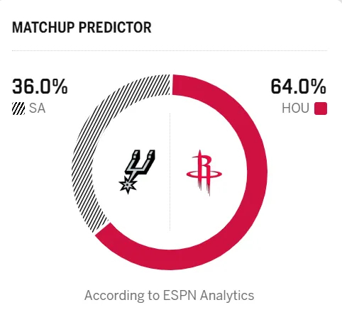 ESPN预测,明日马刺对阵火箭。火箭胜率64.0%,马刺胜率36.0%。网页链
