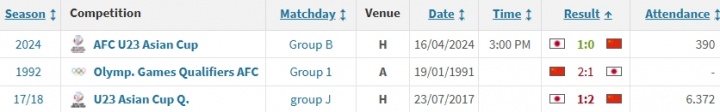 国足U23曾与日本U23有过3次交锋,取得2胜1平的战绩,目前已实现对阵日本的两连胜,唯一一次输球是在1992年的亚足联奥运会预选赛。