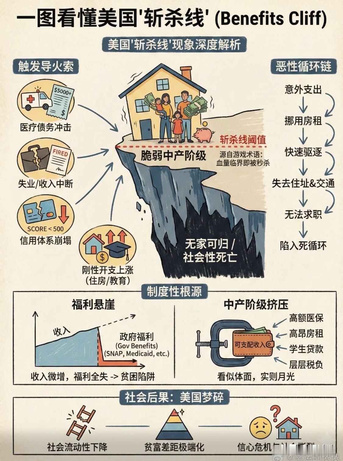 美国“斩杀线”(Benefits Cliff)是指一个家庭或个人收入略有增加,却导致其失去全部或大部分公共援助福利(例如SNAP、医疗补助、住房补贴等),从而使其净收入反而下降的现象。这种制度性的根源导致了贫困陷阱,阻碍了低收入者通过工作实现经济自足。 核心现象解析 福利骤减:当收入增加超过特定门槛时,家庭会突然失去关键福利,新增加的工资往往无法弥补失去的福利价值。 工作动力下降:为了避免陷入福利悬崖,许多工人选择拒绝加薪、额外的工时或晋升机会,这阻碍了他们的职业发展。 恶性循环:意外的医疗债务、失业或刚性支出(住房、教育)增加可能触发“斩杀线”,导致信用崩溃、快速驱逐甚至无家可归,陷入难以摆脱的困境。 社会后果:这种现象加剧了社会流动性下降、贫富差距极端化,并引发了对“美国梦”的信心危机和社会撕裂。 制度性挑战 政策复杂性:联邦、州和地方层面的不同福利计划拥有各自独立的资格标准和收入限制,缺乏协调,导致了意想不到的“悬崖效应”。 中产阶级挤压:高昂的医保、房租、学生贷款和税负使得看似体面的中产阶级实际上“月光”,极其脆弱,容易因意外事件跌落至“斩杀线”以下。 解决方案探索 政策制定者正在探索多种方法来减轻“斩杀线”的影响,例如采用分级收入限制、提供过渡性支持和使用CLIFF(职业阶梯识别与财务预测)工具来帮助家庭规划职业路径。