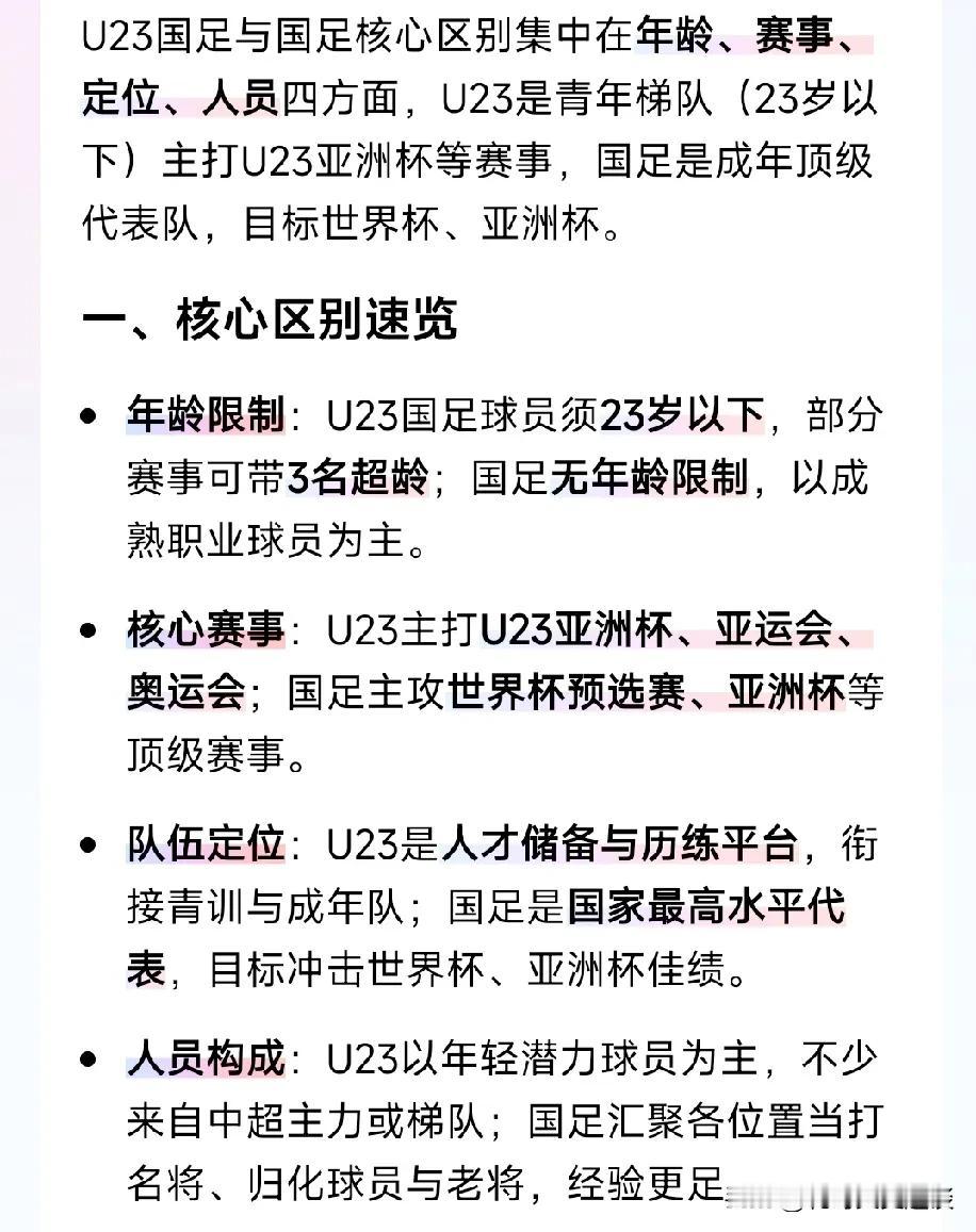 U23国足改写了历史。从他们身上看到了国足未来的希望,他们3:0踢赢了越南,进入决赛对决日本队。 我特地查了U23啥意思,就是队员都在23岁以下,多给年轻人历练的机会,国家的储备力量,他们主要参加亚洲杯赛事。 国足是国家顶级队伍,参加亚洲杯,世界杯。这预备队踢出来成绩比国足还厉害,将来中国足球有希望了。